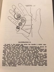 The last part of his book on Automatics is all about what he calls “Practical Shooting“, which he defines as “the ability to draw our gun quickly, align it with speed and discharge it without pulling (flinching), at the target.” His description of how to learn a proper drawstroke should sound familiar to anyone that’s taken a defensive pistol course: