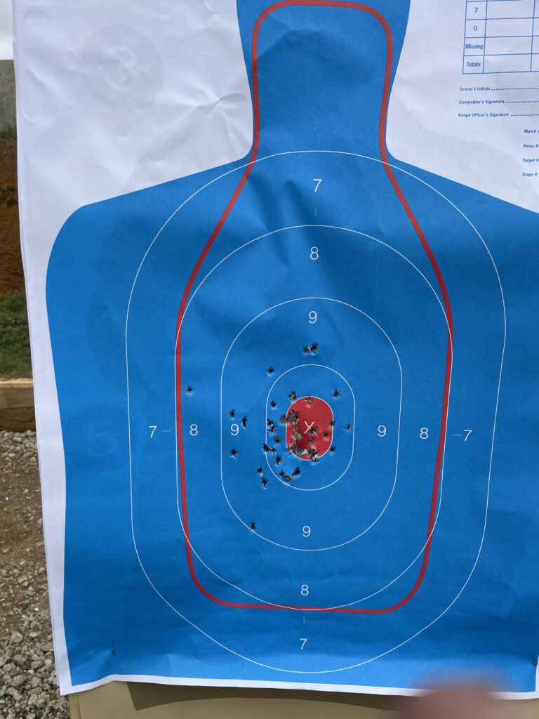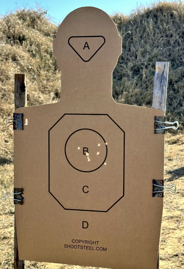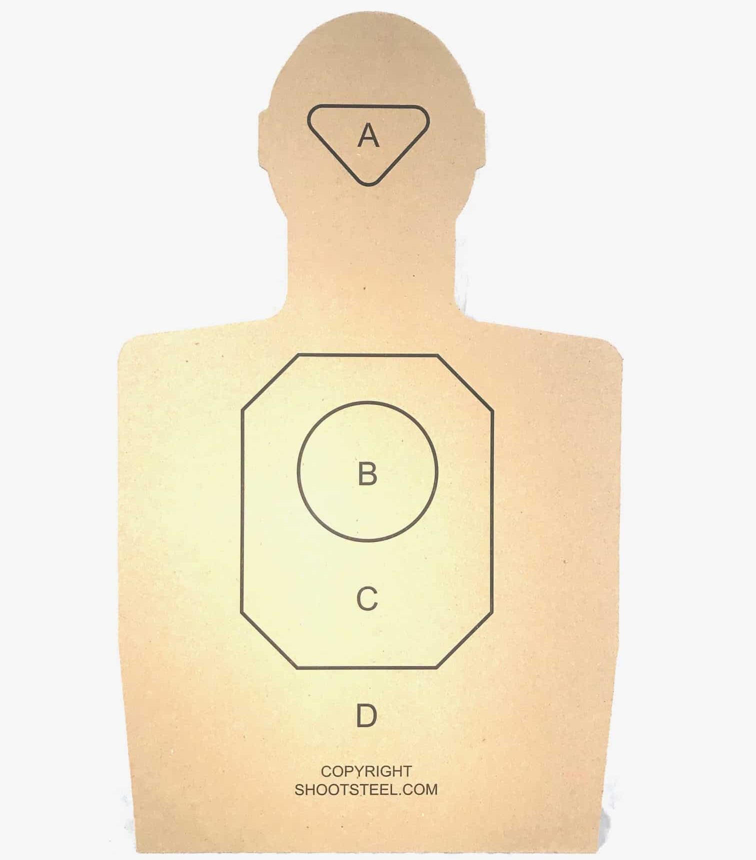 For the first video, a “Shoot Steel” target replacement center was used. I created this paper overlay to use with the Shoot Steel company’s cardboard targets, which I like better than USPSA or IDPA targets for defensive pistol practice. The Shoot Steel cardboard target has a smaller “A-Zone” and more realistic features, including a head area that includes a neck and ears instead of a simple square “head box”.