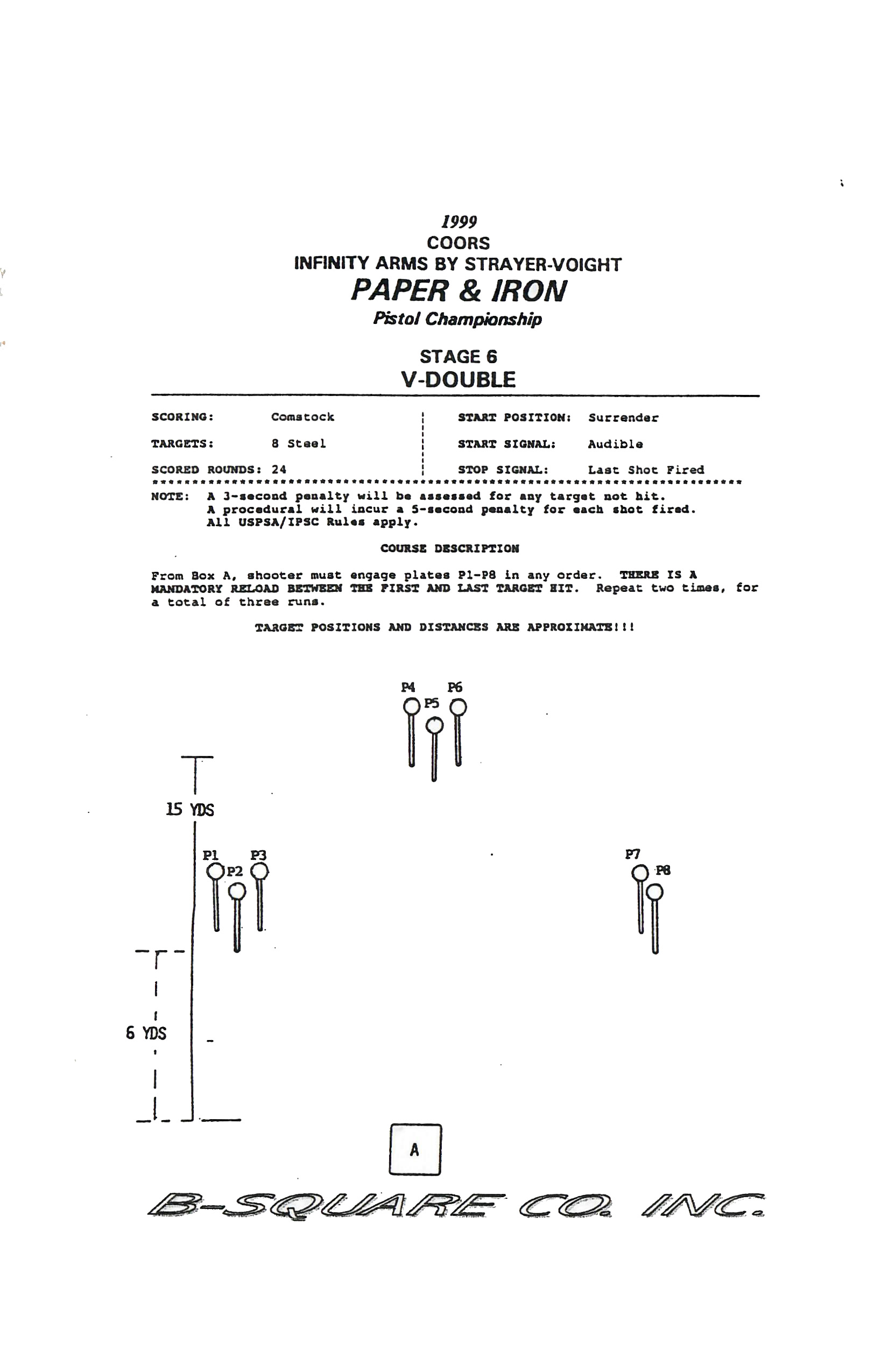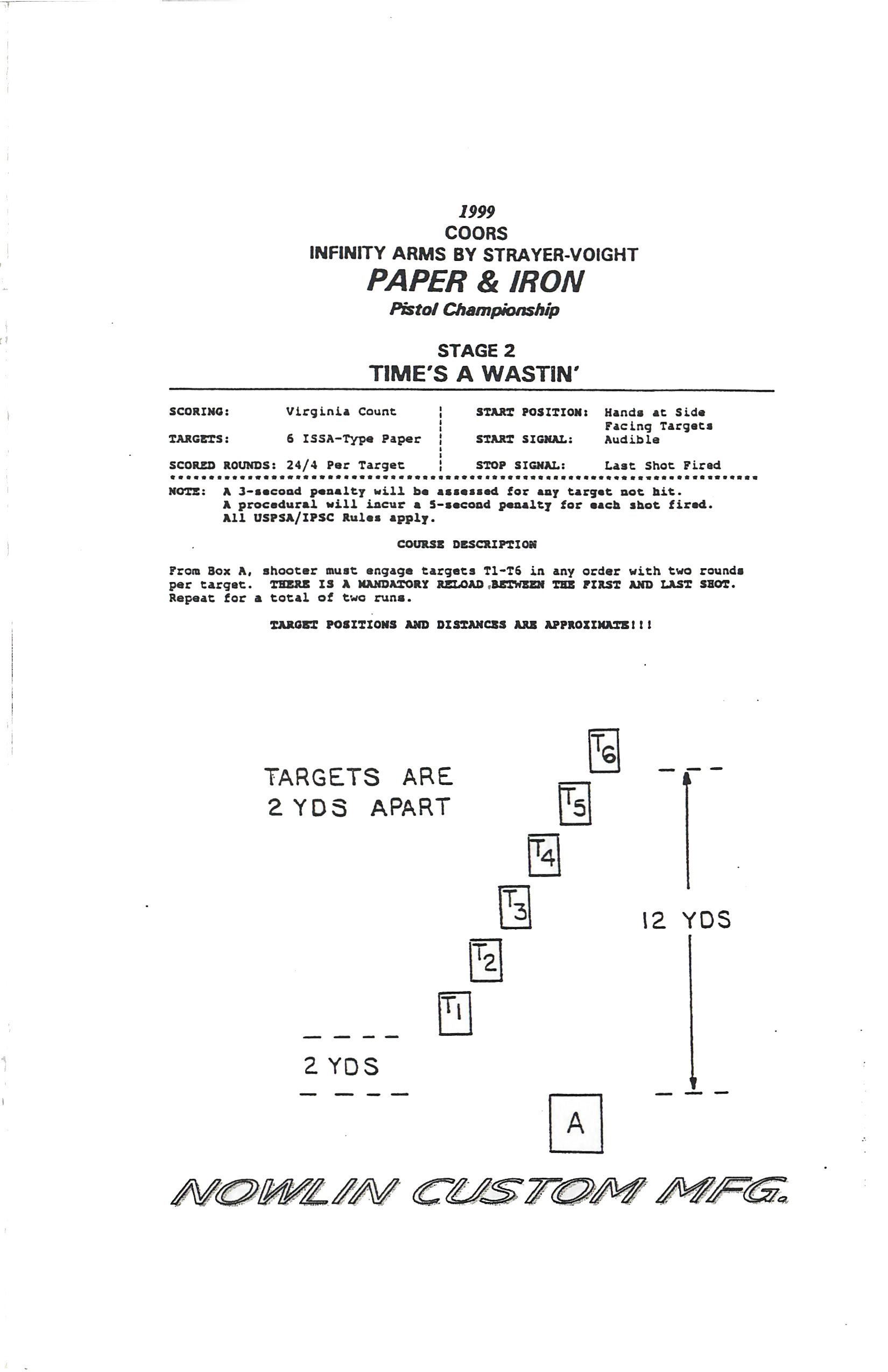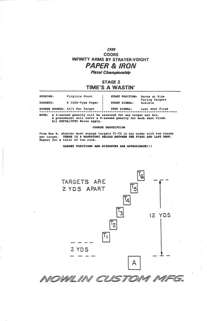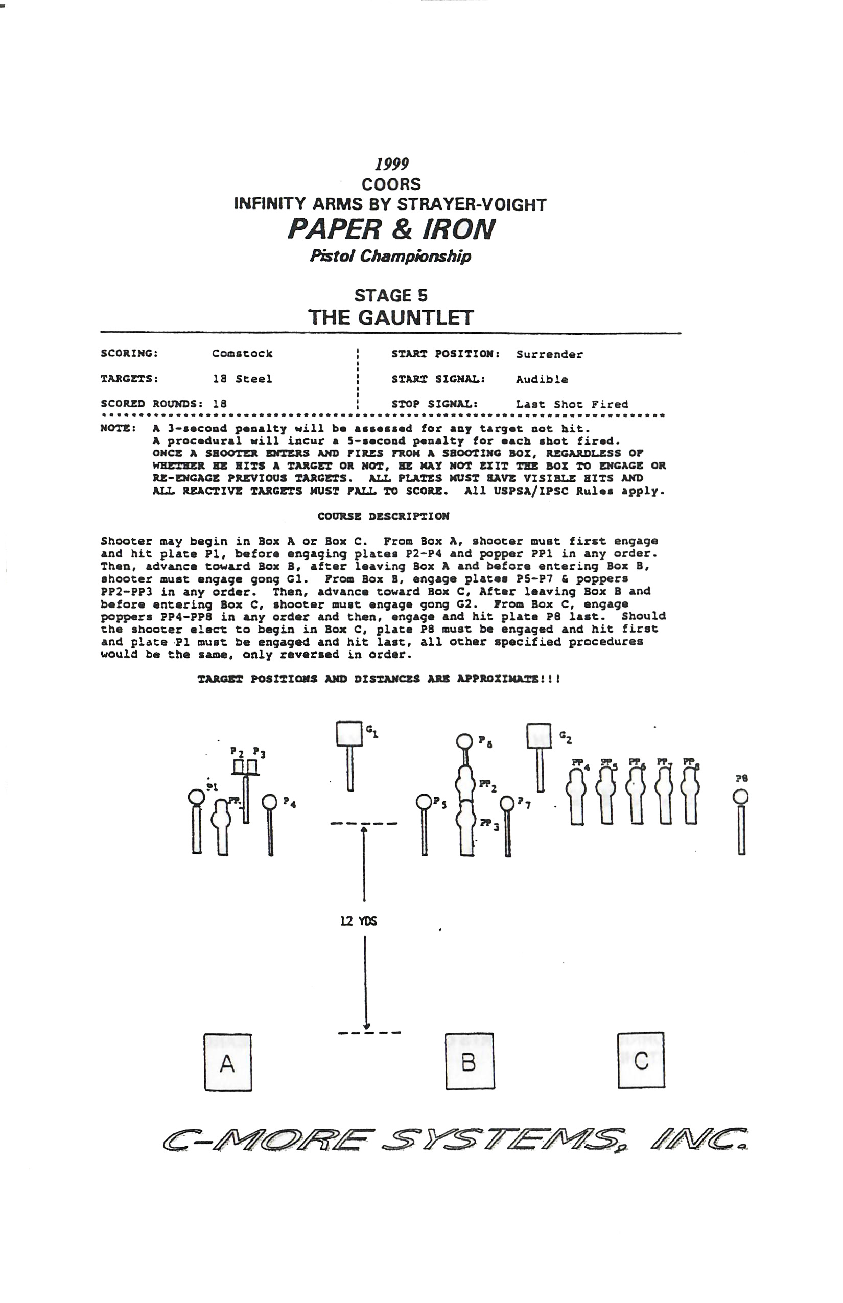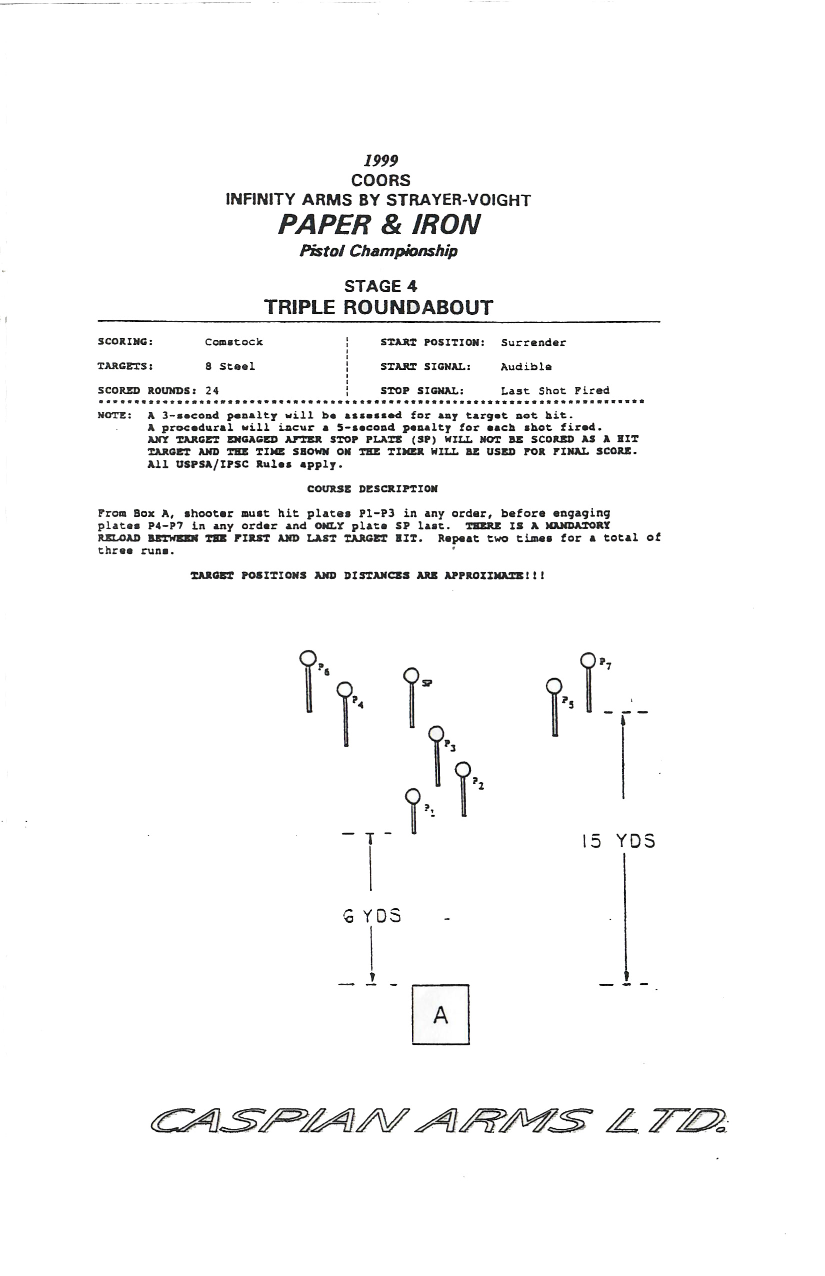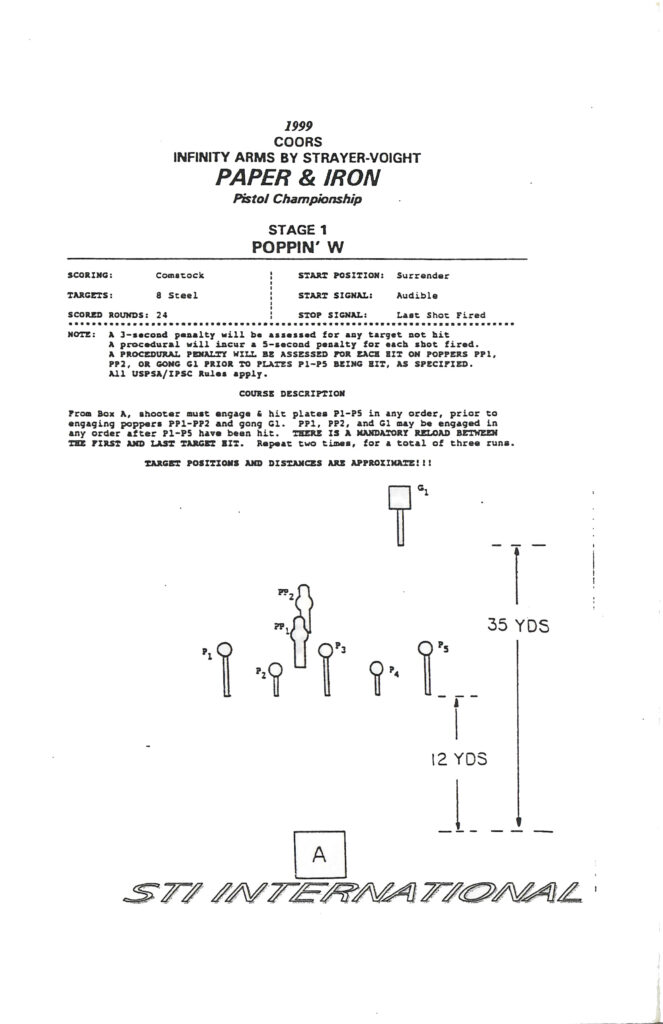 Poppin W was a mix of stationary and falling steel. 3 runs, all counted for score. Everyone had to do a mandatory reload between first and last shot. You had to shoot all 5 stationary steel targets before engaging the two falling steel and the gong. The falling steel were stacked one behind the other, with a smaller falling plate behind the large one. Most people would shoot the 5 stationary plates, the large steel, reload and shoot the last two plates. My stage runs from 1999 were all around 7 seconds, with sub 6’s being my training goal.