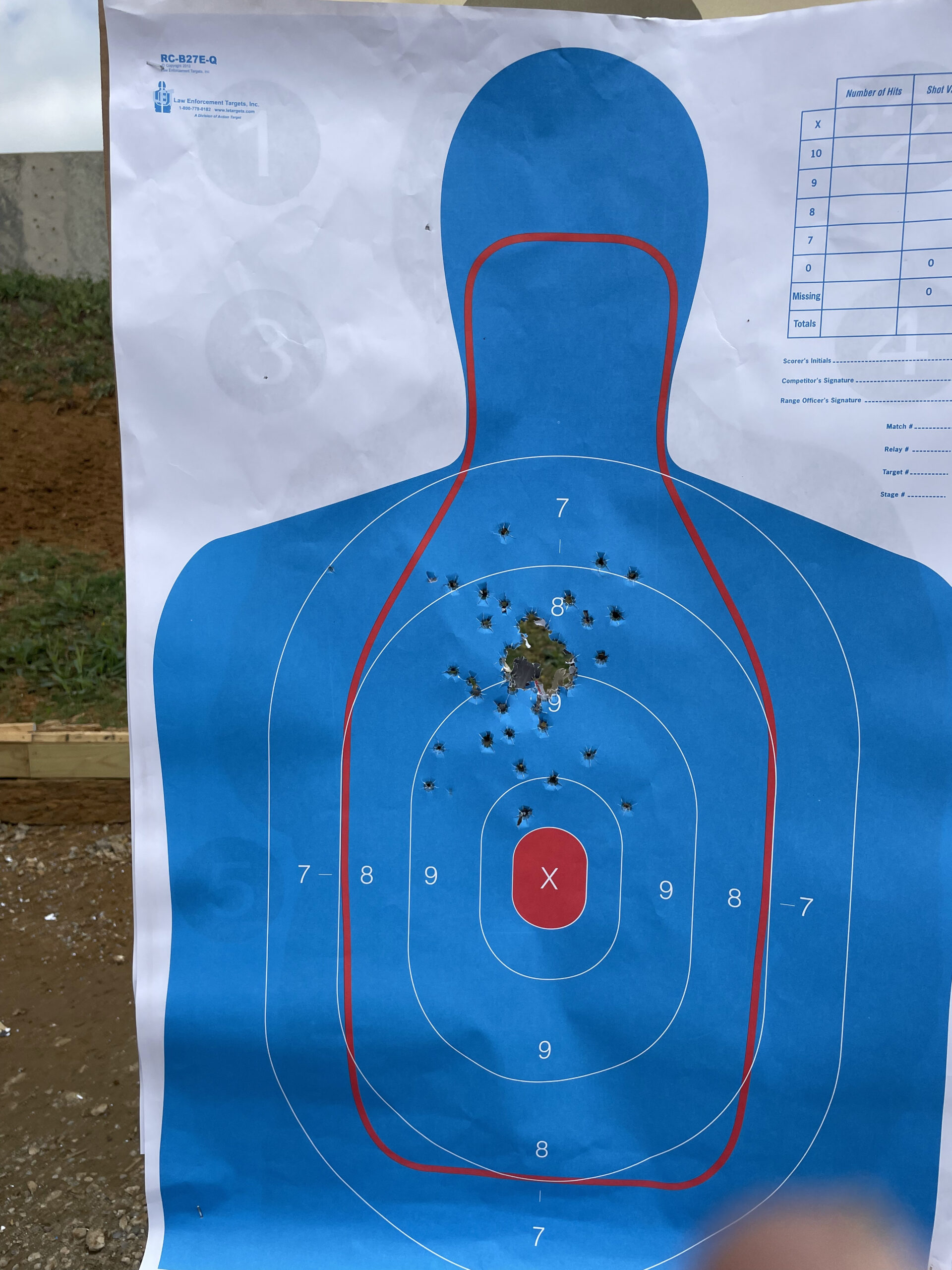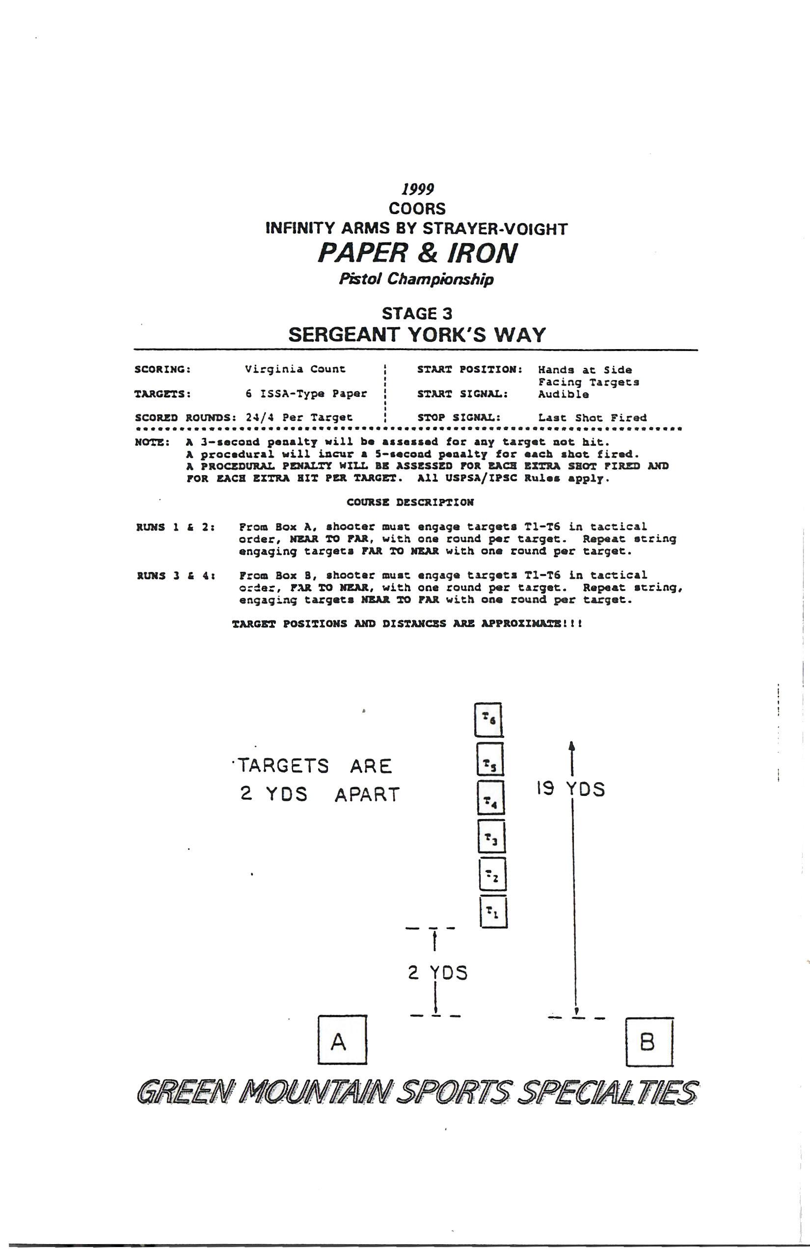 Sgt. York’s Way was a 4 string, 6 round drill where you shot all 4 variations: front to back, back to front, each from the left and right boxes. The back target was at 19 yards and the front target was at 2 yards, so the shooter’s ability to adjust their transition speed (and not overrun the zero down zones) was key.