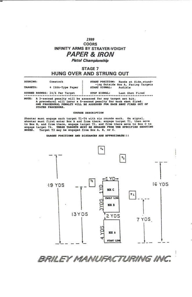 Hung Over and Strung Out was a moving Bill Drill stage that involved precise footwork to be in the correct box for each target. Back in the single stack days it required two reloads, which meant reloading during one of the 6 shot engagements. 6 on T1 as you moved forward in Box A, 2-4 on T2 from Box B, 2-4 more on T3 as you moved into Box C, then a flat footed reload in Box C to fire remaining shots on T3 and 6 on T4. 24 round magazines made this stage a lot easier.