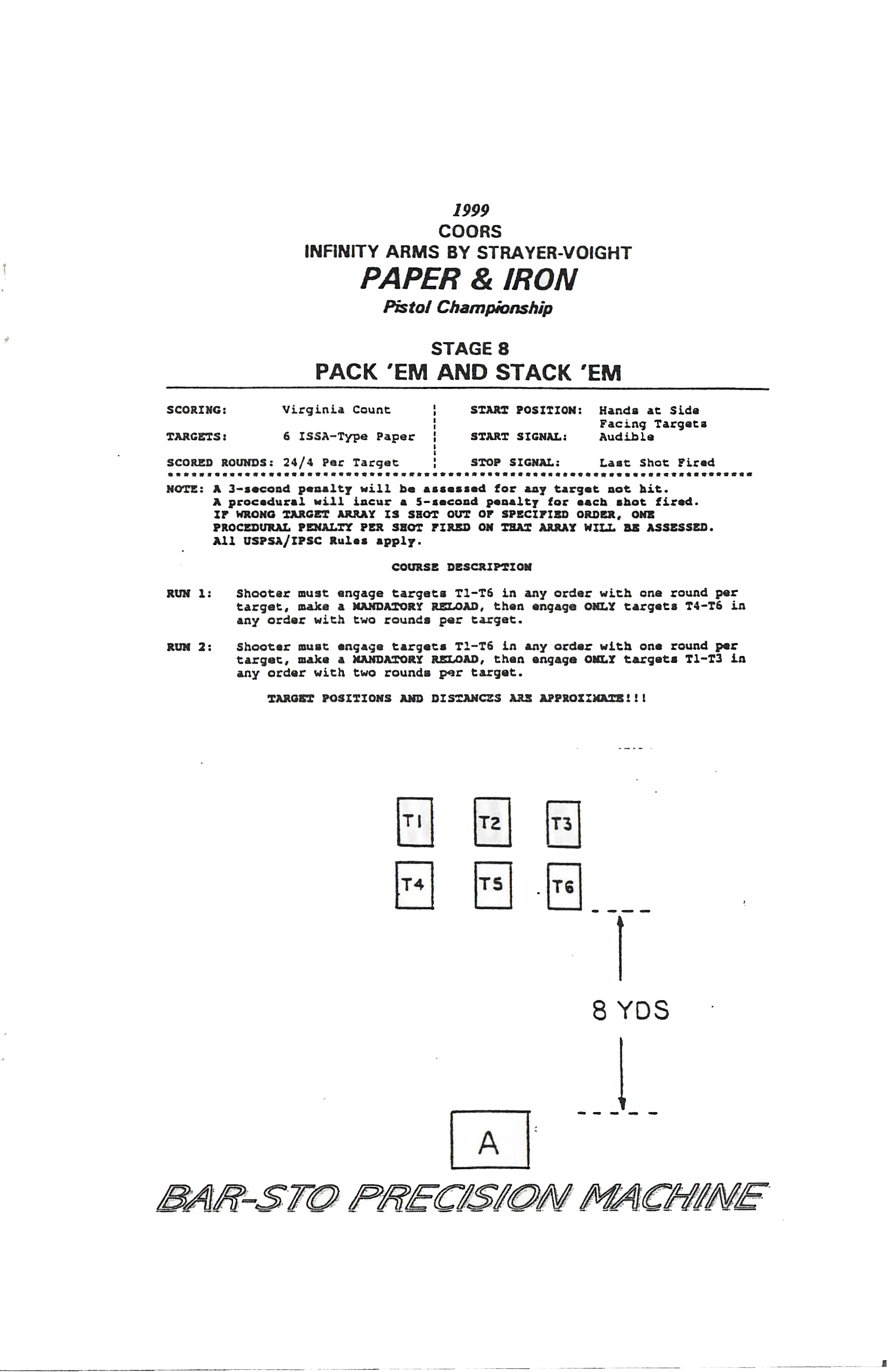 Pack Em and Stack Em was another paper stage, one shot per target, top row reload bottom row, repeated for bottom row reload top row. Unlike Steel Challenge every run at Paper and Iron counted for score. When they switched to the taller D1’s, I remember the bottom row of targets starting at ground level, with the top part of the tombstone D1 overlapped with the bottom of the top row, to keep the target stack from being taller than the berm.