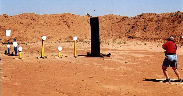 This stage is from the 2001 match, where they switched to using the NRA D1 target instead of the original ISSA’s, after they ran out of the original production run. The D1 was used for Bianchi Cup and Glock Shooting Sports matches and were easier to get. They also offered a larger area outside the 12″ circle, which turned a few would-have-been-misses into 0.5 penalties on this hose-fest stage.