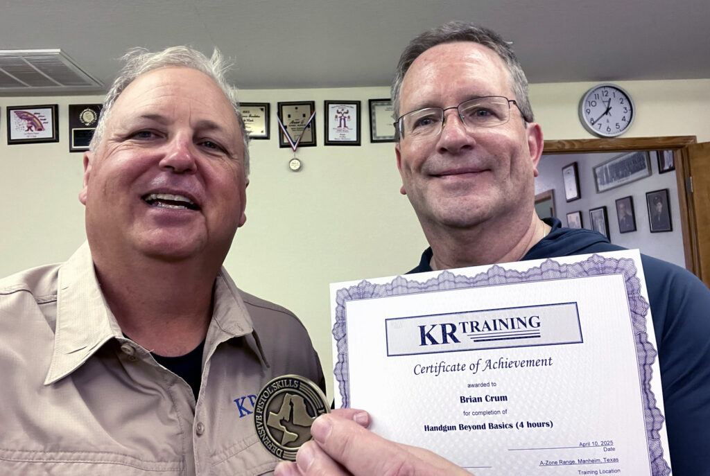 2025 was another busy year for KR Training, with 42 weeks of classes, matches and special events. Guest instructors included Chuck Haggard, Chuck Baxter, Massad Ayoob, Gabe White, Matt Little, Greg Ellifritz, Chuck Pressburg, Tom Givens, Ben Weger and James Beck. The A-Zone became the home range for Lee County 4-H Shooting Sports. KR Training instructors were also on the road, presenting at conferences, taking classes from other trainers, and coaching the Texas A&M Corps of Cadets Marksmanship Team to a national championship.