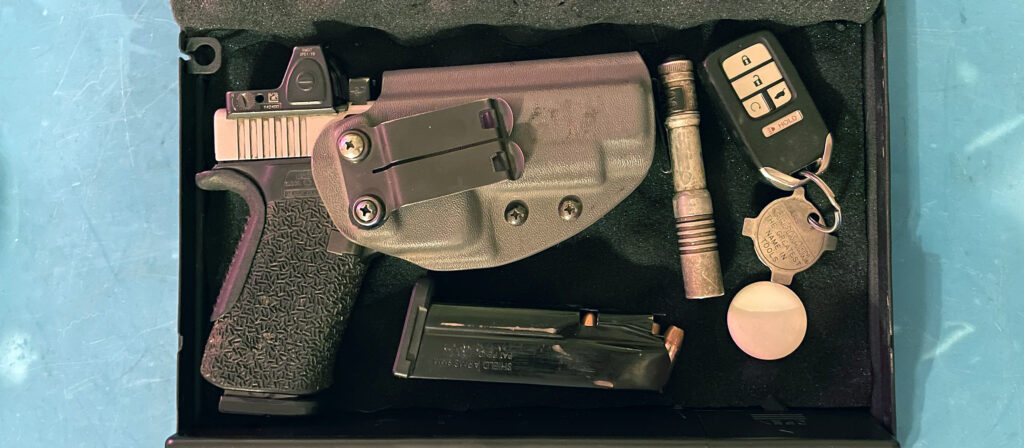 Defensive Pistol Skills 1, coming up Saturday Sept 6 in a small class, 3 hour format, teaches you how to select and safely use a belt holster for concealed carry. Even if you only plan on “carrying in the car” or at home, a holster can be useful. My article on car carry in the NRA’s Shooting Illustrated explains in more detail. Every pistol shooter should have a practical holster for their gun – and mass market holsters sold in gun shops and at gun shows are typically low quality. You can spend the same money online from a quality vendor and get a much more useful, safer holster