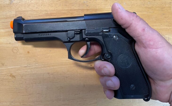 The biggest problem is ergonomics: those with shorter fingers and less hand strength will have a difficult time reaching and pulling the longer, heavier double action trigger on most traditional double action designs. This picture shows the problem. I’m holding the M9 airsoft gun (same size as actual M9) with the frame and barrel properly aligned with my hand and arm, but the best I can do is get the side of my finger to the trigger, and my entire trigger finger is mashed up hard against the frame.