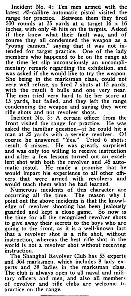 Fellow handgun historians Craig, Gaston and Jay have been going through old issues of “Arms and the Man” and American Rifleman looking for historically interesting articles to share. This one, from 1918, details the failures of pistol shooters using “point shooting” techniques to hit targets. The author of the article was the secretary of the Shanghai Rifle and Revolver Club.