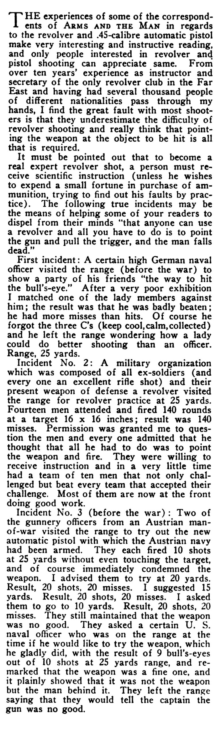 Fellow handgun historians Craig, Gaston and Jay have been going through old issues of “Arms and the Man” and American Rifleman looking for historically interesting articles to share. This one, from 1918, details the failures of pistol shooters using “point shooting” techniques to hit targets. The author of the article was the secretary of the Shanghai Rifle and Revolver Club.