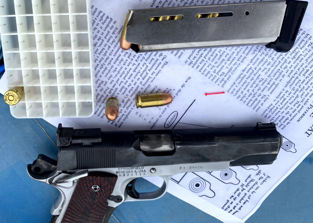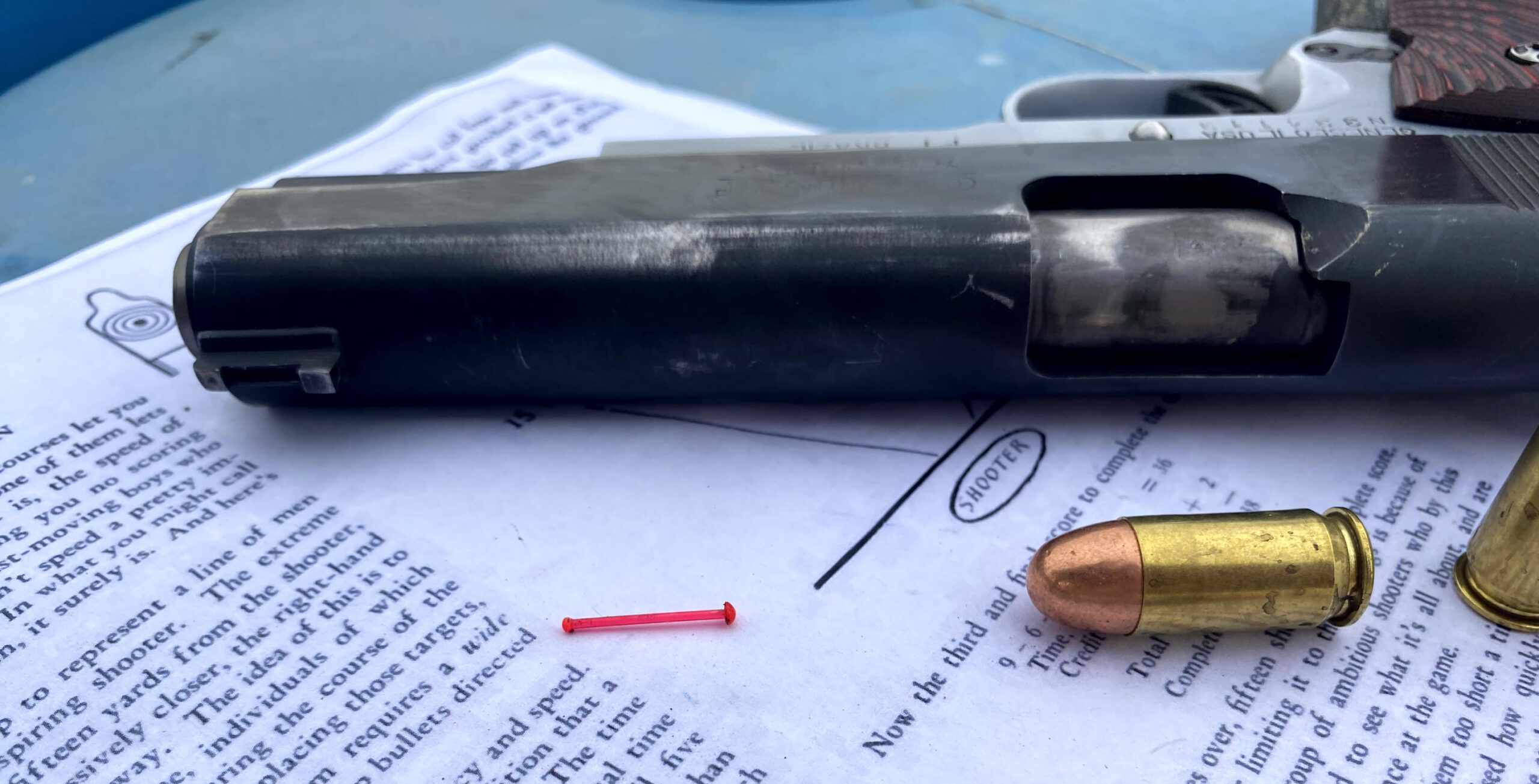 I got out my classic 1911 in .45 ACP, loaded it up with full power .45 ball ammo and ran the course of fire using the vintage one handed technique described in the article. After the first couple of shots, the fiber in my front sight came out (apparently I didn’t cut the fiber long enough and when I melted the ends there wasn’t enough to hold it in place under recoil). Since they didn’t have fiber optic front sights back in 1941, I left the fiber out and shot the course without the fiber insert.