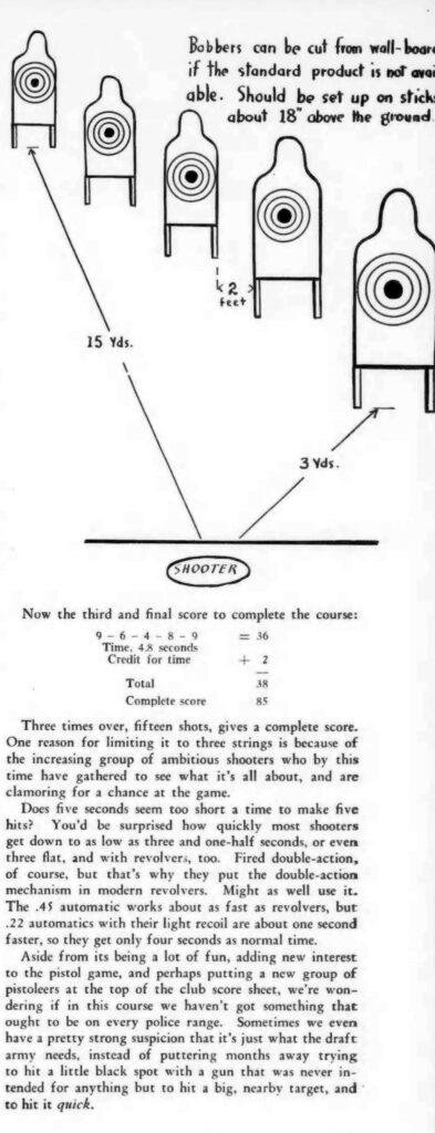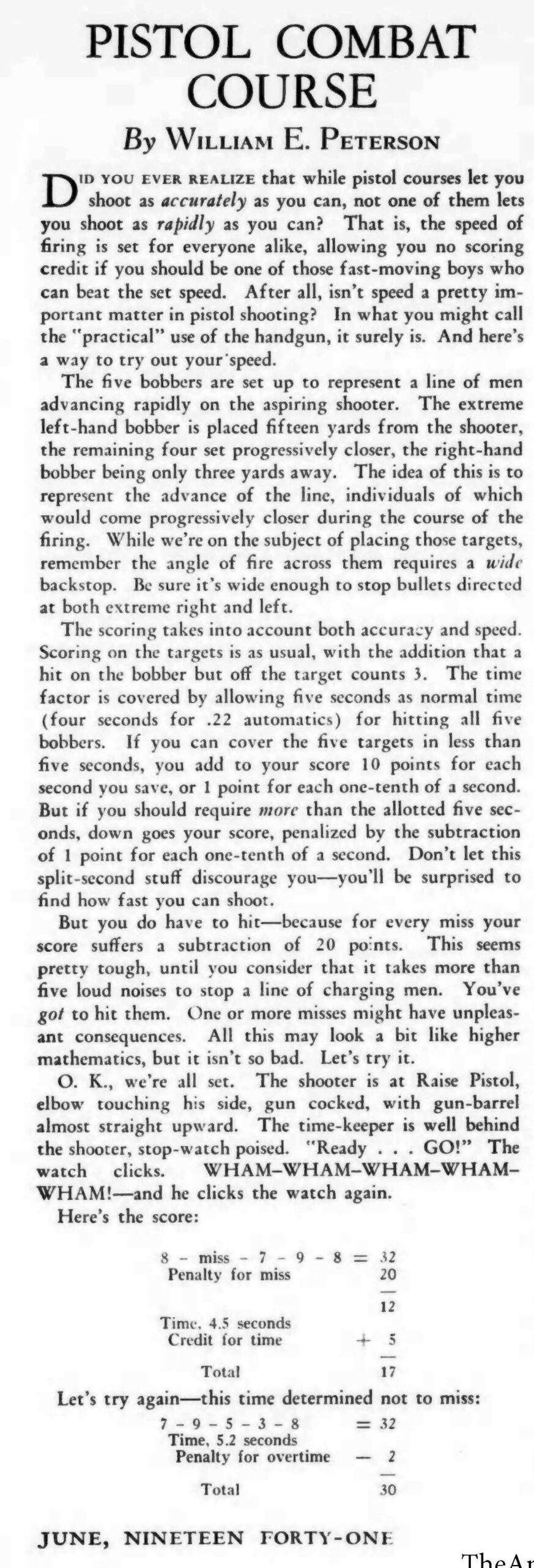 My historical research team sent me this article from a 1941 issue of American Rifleman magazine. It details a “pistol combat course” shot using a silhouette target w/ center bullseye and a scoring system that is a distant cousin to the Time Plus scoring using in IDPA and the Comstock scoring used in USPSA. The stage design is very similar to the Steel Challenge stage “Five To Go”.