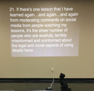 John Correia of the Active Self Protection youTube channel gave a long presentation on 21 points learned from his observation of more than 12,000 videos of gunfights. I recently became an ASP-affiliated instructor, so I’ll be using some of John’s 1100+ narrated videos of actual incidents in classes.