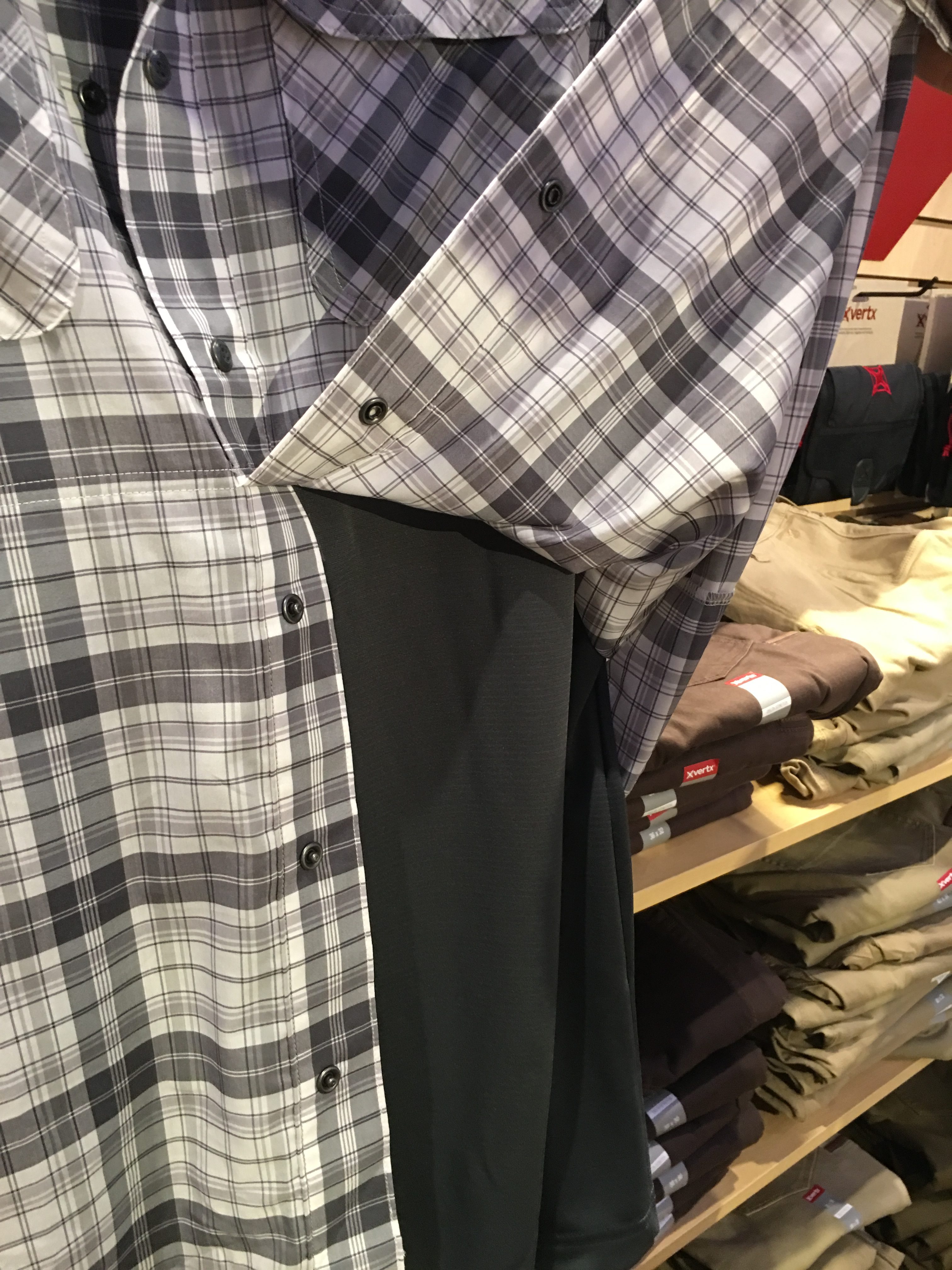 This particular Vertx shirt includes an interesting feature: an integral “half undershirt” attached to the shirt, to make it easier to wear a single carry garment and still have a layer between bare skin and the gun. That idea is clever, but the shirt itself is too casual for professional wear.