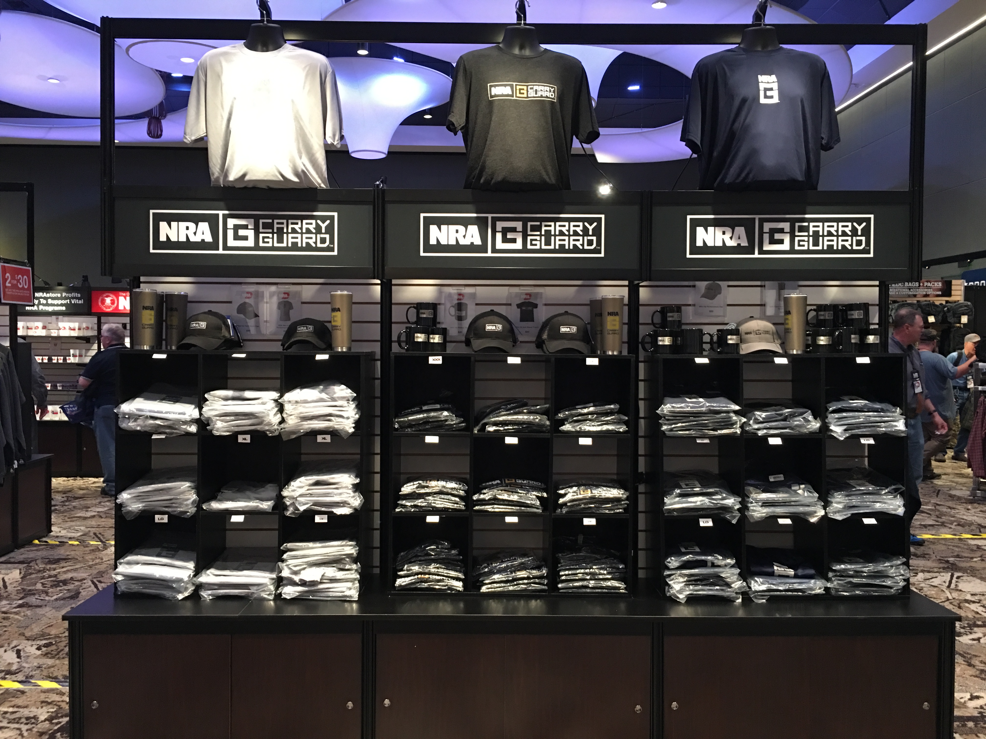 Had a stroll through the NRA store, where all the various NRA-branded items were on sale. Propper, Vertx and 5.11 also had booths inside the NRA store, and I got to chat with one of the Propper execs who was working his own booth. Double bonus, I was wearing Propper pants and a Propper shirt – all items they had discontinued – and got to talk to the exec about product needs of those carrying concealed in upscale business casual environments. One big blind spot for all the ‘tactical’ clothing companies is that they think their market is cops – so garments have features intended to appeal to cops, on and off duty. Reality is that there are less than 1 million cops, but more than 13 million carry permit holders. That’s a much bigger market. Most of the “concealed carry” shirts and parts that these companies produce have pockets in weird places (Propper shirts have sideways secret chest pockets held closed by magnets) that do get noticed by women and others that pay attention to how others are dressed.