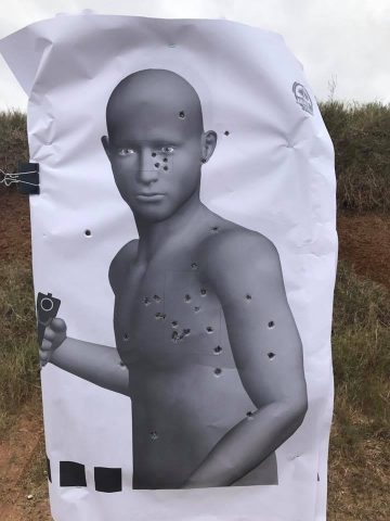 Range time emphasized one handed shooting, trigger control and muzzle direction awareness. Handling a gun in close proximity to family members, particularly those that may be at waist level or lower, poses unique problems. For most of the shooting drills we used their custom paper targets that presented front and side views of an armed threat.