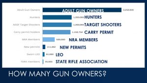 The national landscape appears to be this: there are 311 million people in the US. 247 million adults. 55 million gun owners. Of that 55, NSSF estimates as many as 20 million do some kind of shooting each year. John Lott’s data indicates that there are 11+ million carry permit holders. (The growth of constitutional carry, where no license is required, is going to make an accurate estimate of the number of carry permits more difficult.) The NRA claims 5 million members, about 1/11th of the total pool of gun owners. NSSF claims that 5 million shoot some type of competition. Whether this is ‘lifetime’ or ‘this year’ was unclear. I think that number likely represents the number of gun owners that have ever shot any match of any kind. Almost a million cops, 125K NRA instructors, and smaller numbers for the competitive pistol sports.