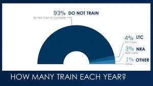 Trying to estimate how many actually train or compete each year was difficult. NSSF does not track “training” as one of their metrics, only target shooting, hunting and competition. TXDPS data shows that on average 100K people take the new permit course each year, and there are 3600+ LTC instructors. That means that the typical LTC instructor is teaching less than 30 people per year.