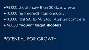 It’s likely that all the regular competitors and serious shooting school students fall into that 3%, so removing them from the pool means there are maybe 76K “frequent target shooters” that like shooting enough, and do it frequently enough, that they might be interested in training courses that go beyond the minimum.