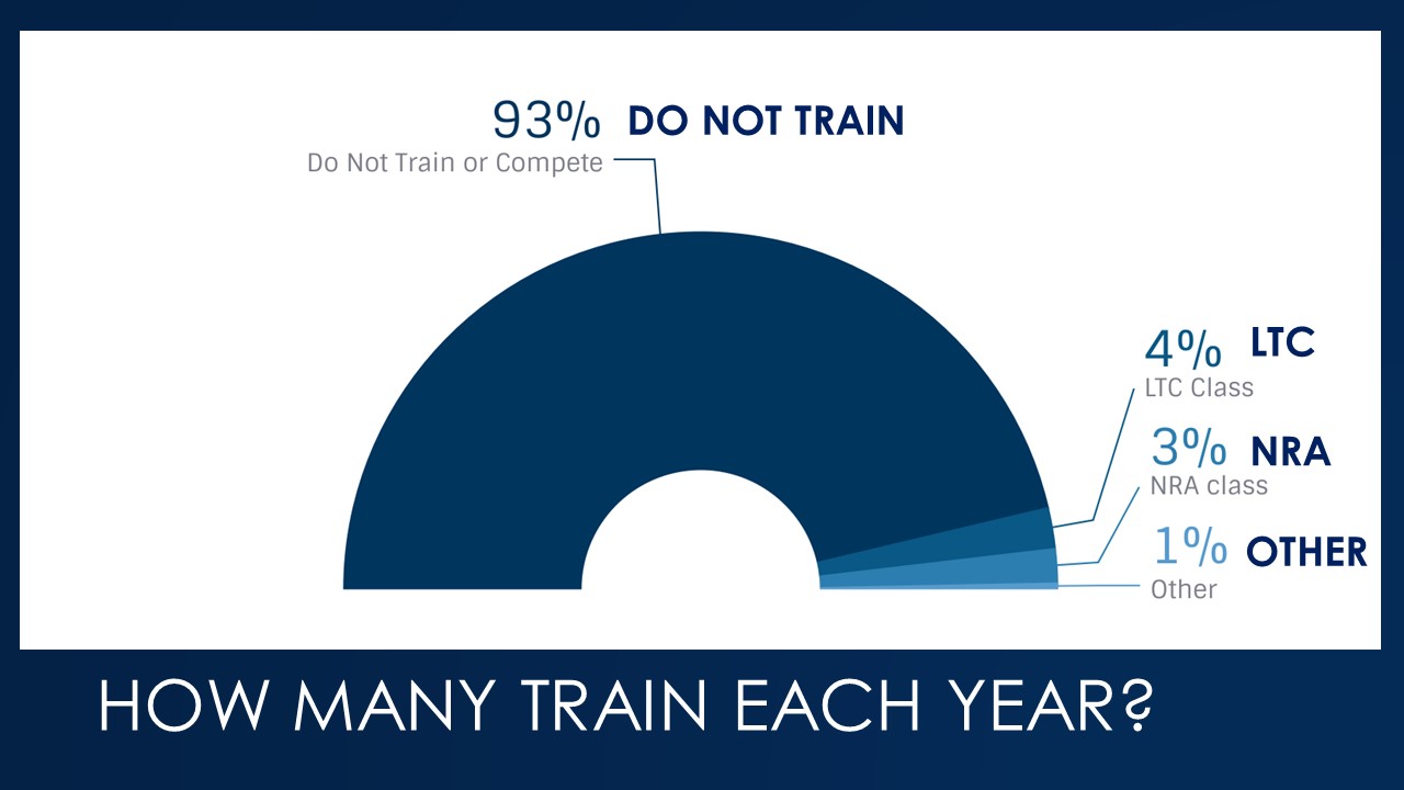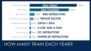 Trying to estimate how many actually train or compete each year was difficult. NSSF does not track “training” as one of their metrics, only target shooting, hunting and competition. TXDPS data shows that on average 100K people take the new permit course each year, and there are 3600+ LTC instructors. That means that the typical LTC instructor is teaching less than 30 people per year.