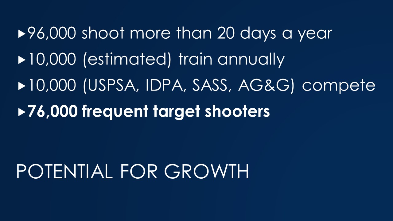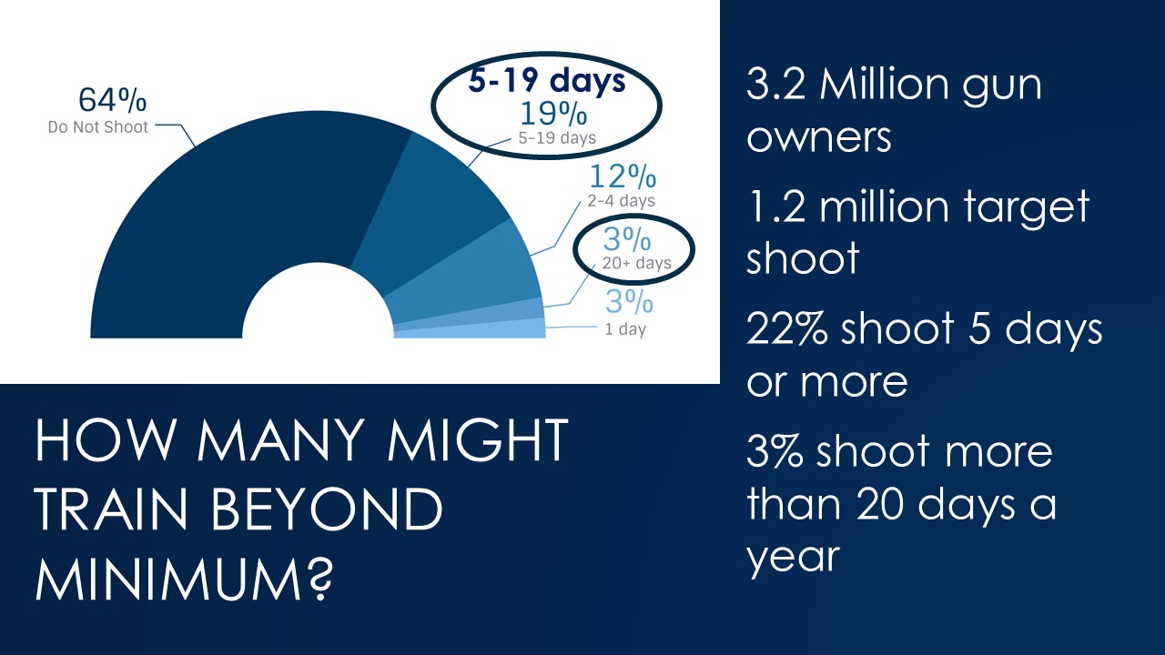 It’s likely that all the regular competitors and serious shooting school students fall into that 3%, so removing them from the pool means there are maybe 76K “frequent target shooters” that like shooting enough, and do it frequently enough, that they might be interested in training courses that go beyond the minimum.