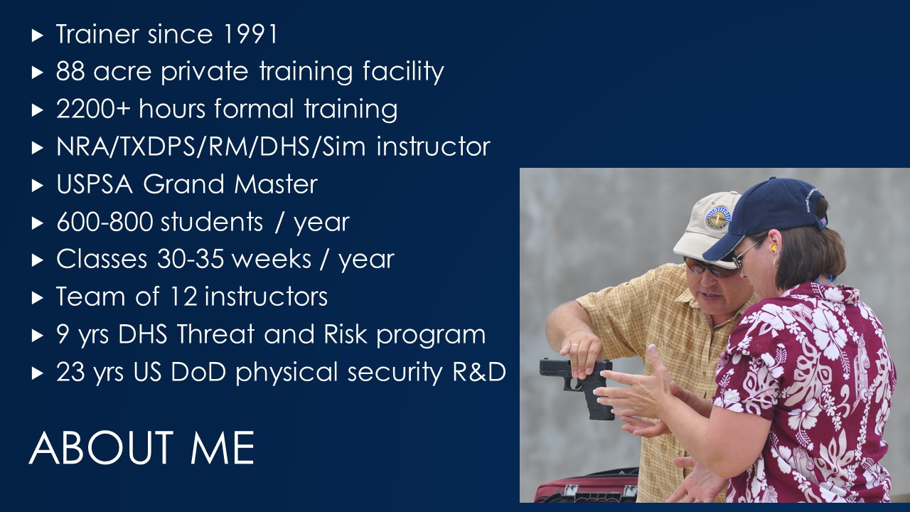 Since this topic may draw readers unfamiliar with me to my blog, I’ll include this slide, which covers my background. I’ve been in the training business for 26 years, have my own 88 acre training facility, a long resume of credentials as a shooter and instructor, and (particularly in the past 8 years) a very active training program offering dozens of different courses, beginner to advanced, and hosting multiple national level traveling trainers each year. I also have several courses that can be taught on the road, including 1 and 2 day handgun skills courses, force on force scenario courses, and a force on force instructor development course. The KR Training website has more information.