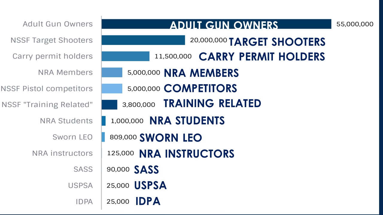 The national landscape appears to be this: there are 311 million people in the US. 247 million adults. 55 million gun owners. Of that 55, NSSF estimates as many as 20 million do some kind of shooting each year. John Lott’s data indicates that there are 11+ million carry permit holders. (The growth of constitutional carry, where no license is required, is going to make an accurate estimate of the number of carry permits more difficult.) The NRA claims 5 million members, about 1/11th of the total pool of gun owners. NSSF claims that 5 million shoot some type of competition. Whether this is ‘lifetime’ or ‘this year’ was unclear. I think that number likely represents the number of gun owners that have ever shot any match of any kind. Almost a million cops, 125K NRA instructors, and smaller numbers for the competitive pistol sports.
