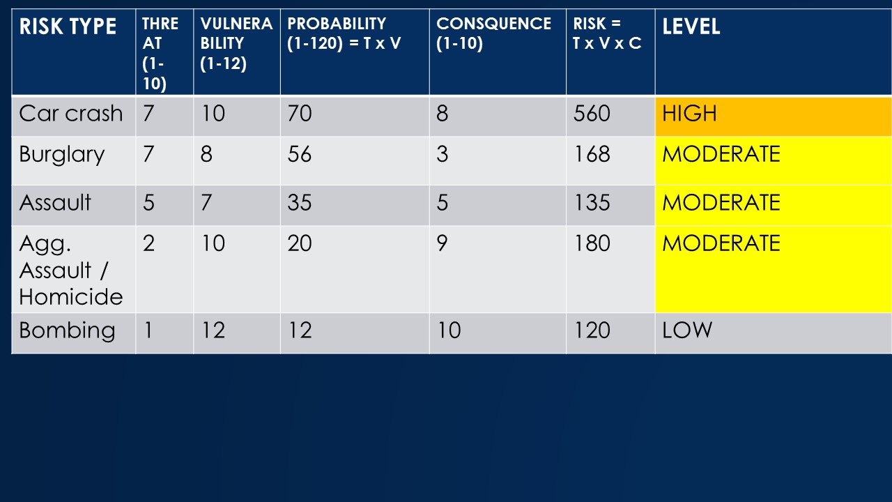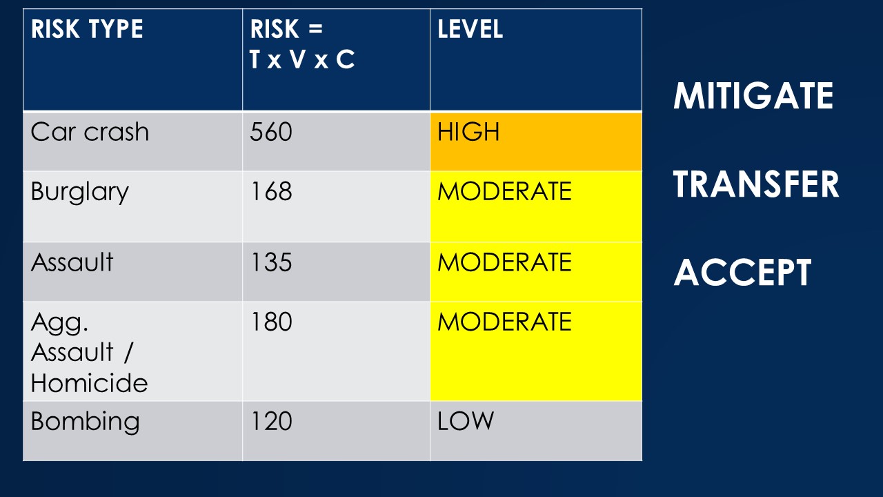 The courses uses this risk assessment graph, which plots probability (threat x vulnerability) vs. consequences. It considers both the odds and the stakes. To reduce total overall risk, identify which risks are highest and then explore options to reduce those risks, by lowering the threat, the vulnerability or the consequences.