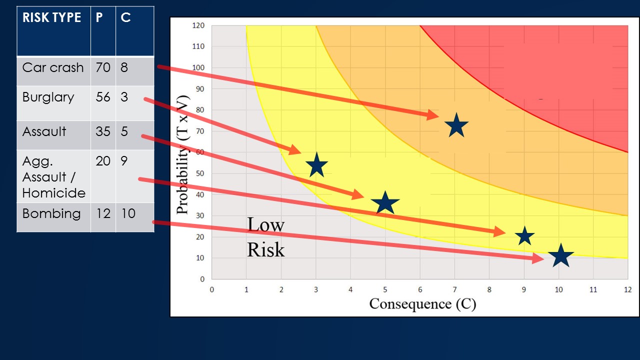 Based on statistics, an auto accident is the most likely risk, followed by the other examples I listed. The process for determining values is a relatively unscientific one. Each individual, in this case, is instructed to set the values using a consistent scale, calibrated by statistics for their geographic area and lifestyle. Your numbers will likely be different from mine. Mine map to these locations on the graph. Some are medium probability, medium consequences. Others, like the bombing risk, are low probability but higher consequence.