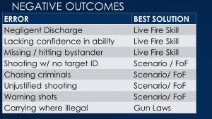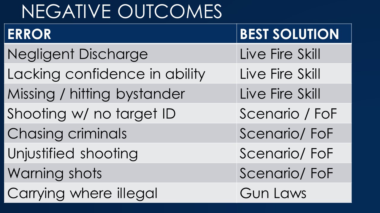 I reviewed Claude Werner’s list of Negative Outcomes that frequently occur to armed citizens, and paired them with the best solution to reducing them. Scenario based force on force training, not just Simunition fight club/gunfight classes but even simple red gun roleplay and video simulators, develop skills that aren’t trained much or at all in typical live fire classes.