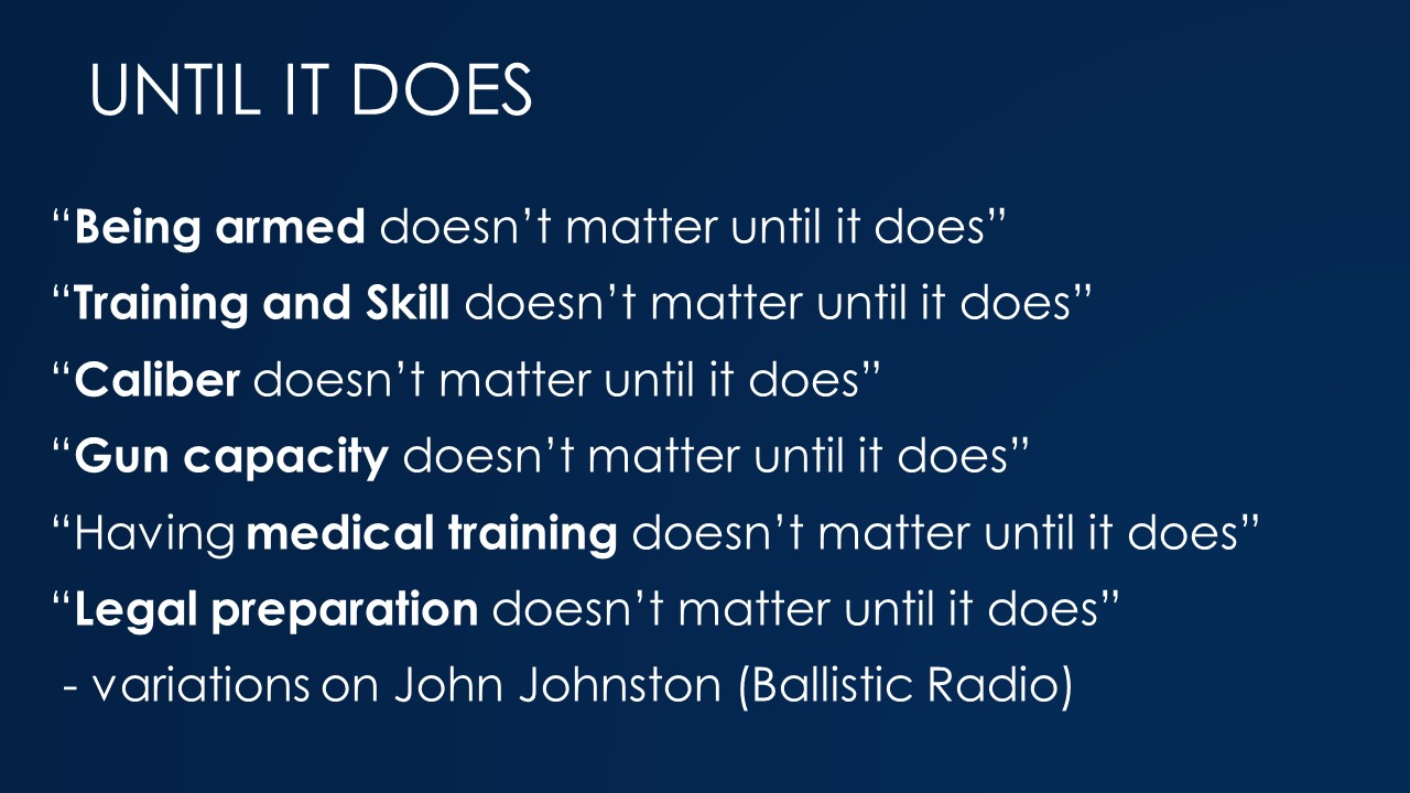 I adapted a phrase I’ve heard John Johnston use on his Ballistic Radio show. For someone that goes through life and never needs a gun or the skills that go with it, they aren’t important. Perception of the need for skills affects motivation to train and selection of courses to attend.