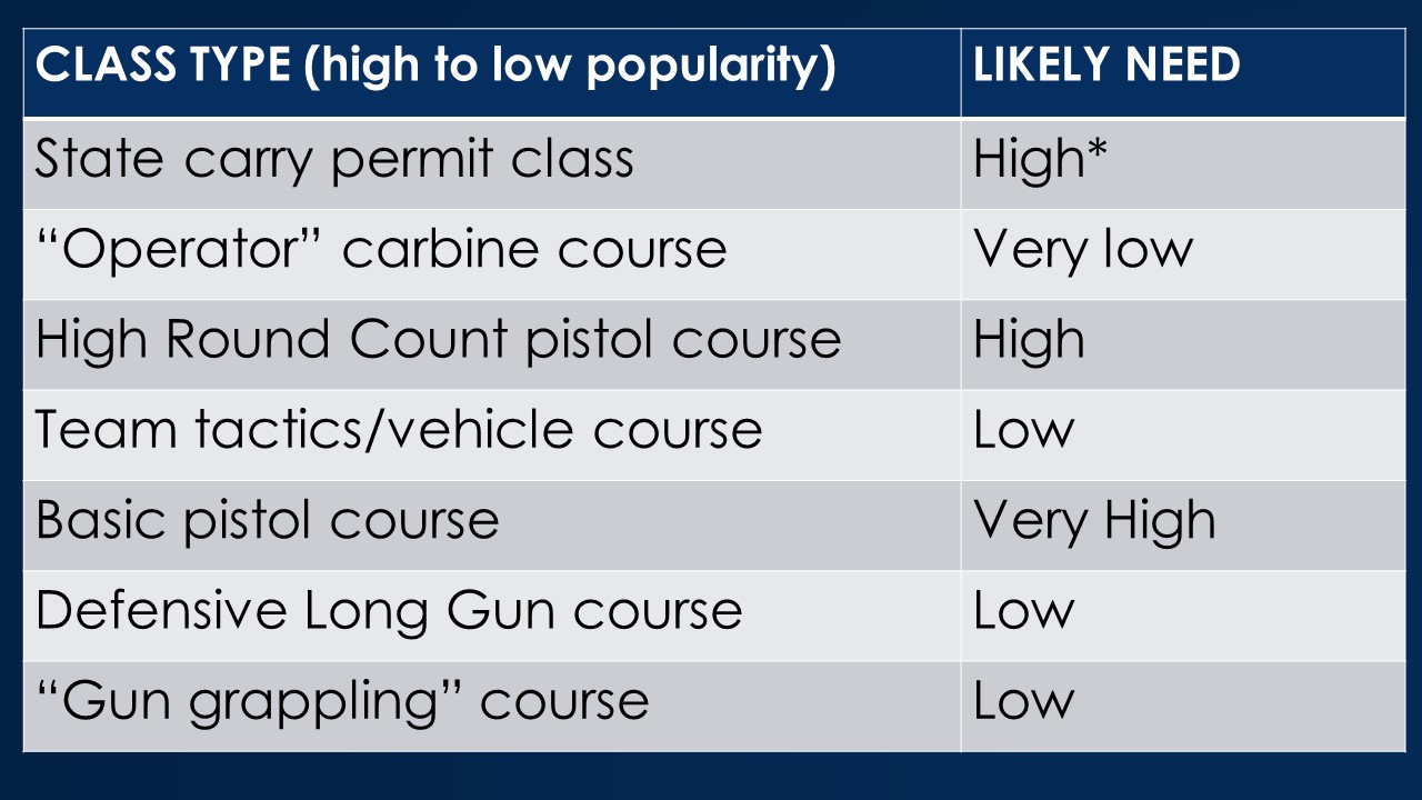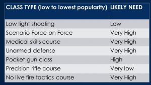 The state carry permit is the most “needed” – not because the content is useful, but because the class is required to be able to carry. All the other classes on page 1 are live fire courses, with the “operator” carbine course — the one you take with your chest rig and dump pouch and multicam and so on, being the most popular but the least likely to be needed. I separated long gun courses that were more focused on home and building defense (including carbine and shotgun courses together) as a separate category from the “enterTrainment” classes.