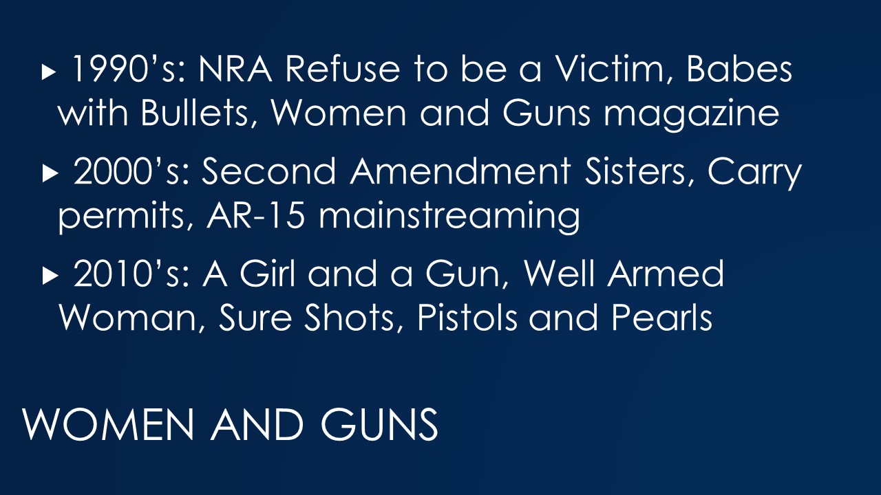 The Second Amendment Sisters organization shut down in 2015, but was very active in the 2000s, promoting the idea of gun rights (and armed self-defense) to women. The larger cultural changes of the mainstreaming of concealed carry and AR-15 ownership increased the appeal of shooting to a more urban and self-defense oriented audience.
