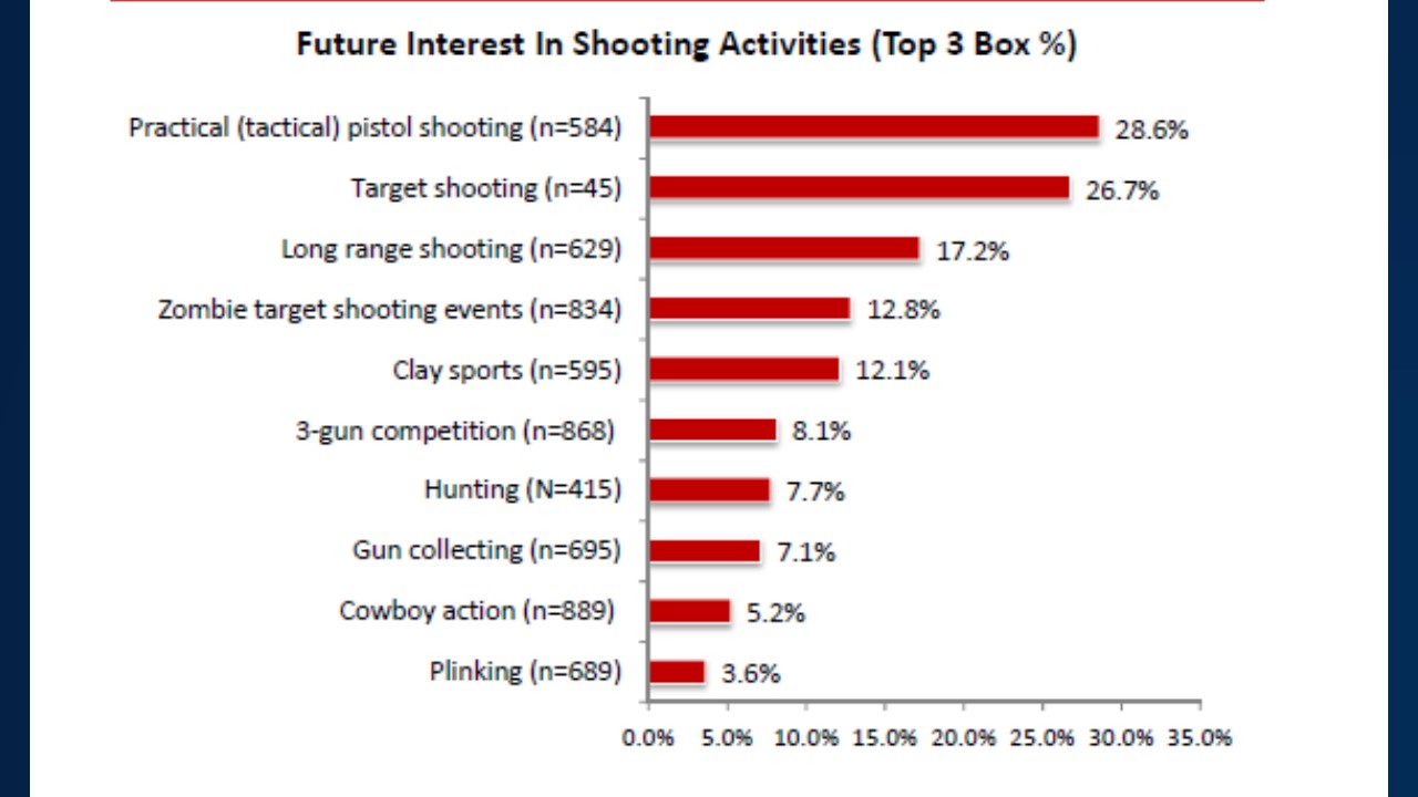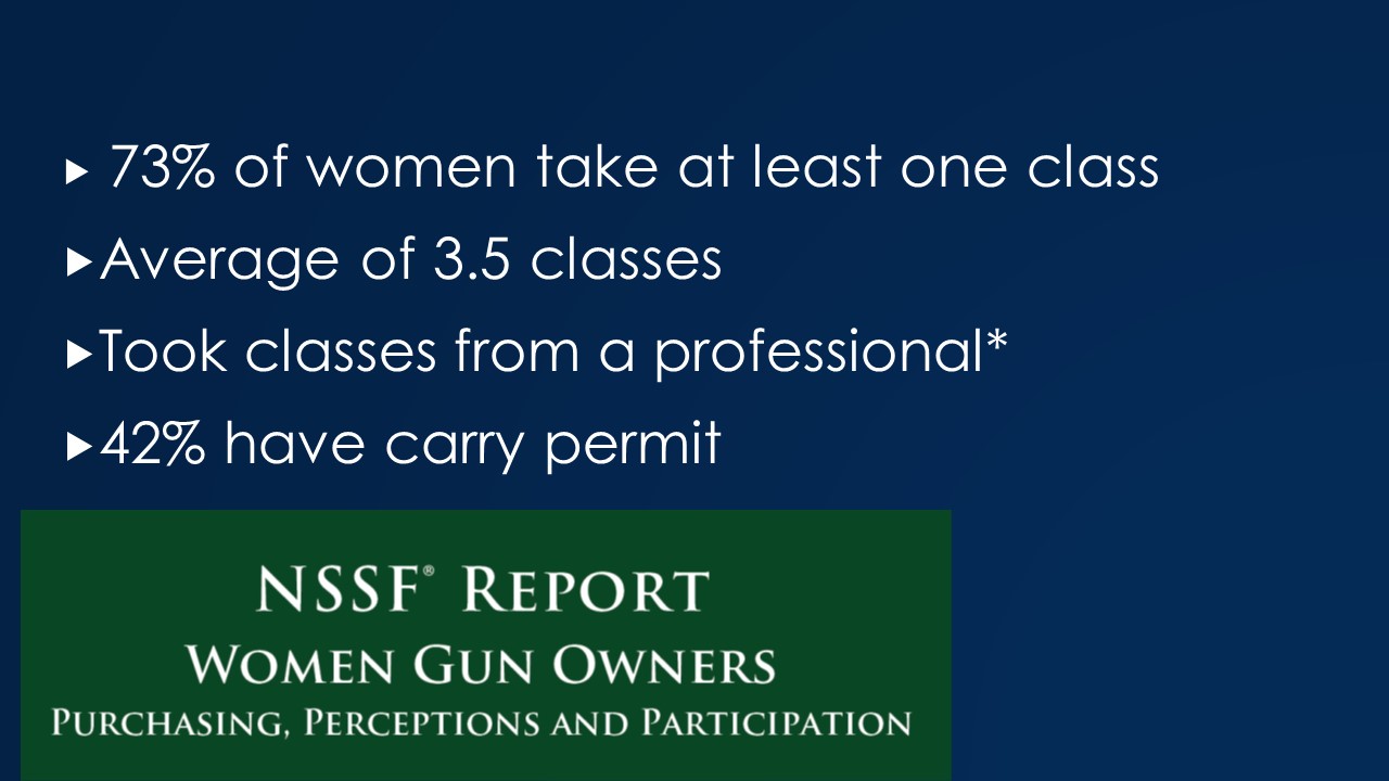Women, particularly those that are Gun Culture 2.0 people not raised around firearms and starting an interest in firearms from outside the gun culture, seek out training, often provided by these women-oriented or women-only clubs. The carry permit (and self-defense) remains a key motivator. I put an asterisk by the term “professional” because in many cases those providing training at the club level are often NRA basic pistol instructor level or state carry permit level or similar part time/volunteer level. The important trend is that within that subculture, the idea of attending a course is more common than with gun owners in general. NSSF survey data of national “A Girl and a Gun” club members showed interest in activities at higher levels and with different priorities than the data in previous parts of my talk indicated for all gun owners.