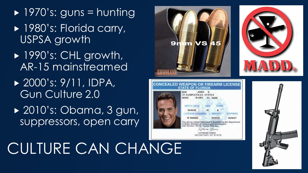 Culture change doesn’t occur on its own. The messages people hear and the examples high profile people set affect opinion and behavior. Sometimes ideas that start in a quiet corner spread quickly because they are the right idea at the right time. At this point in history there are a lot of voices, on many different platforms, all being heard by gun owners and pro-gun voters, so potential exists to affect the gun owner opinions that influence their decisions to attend training.