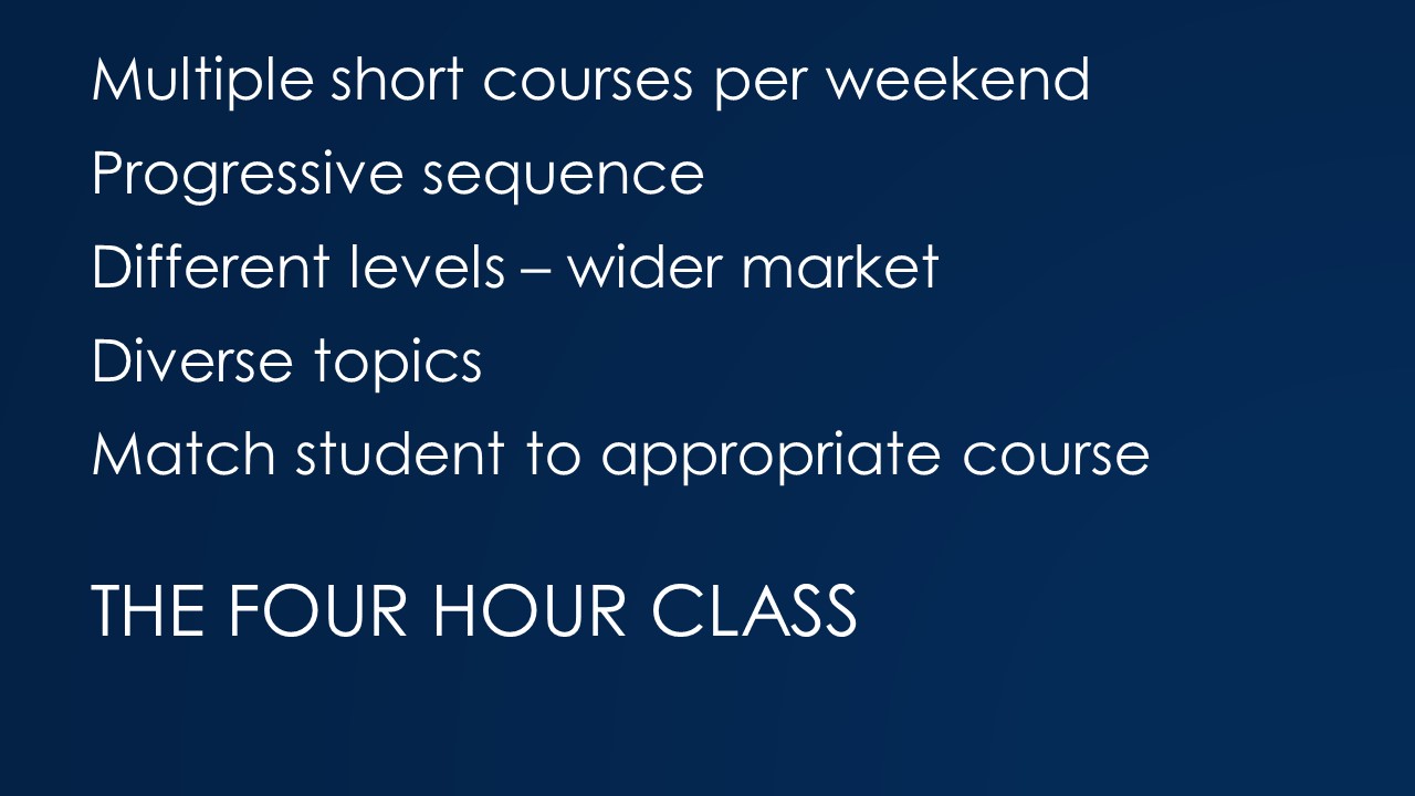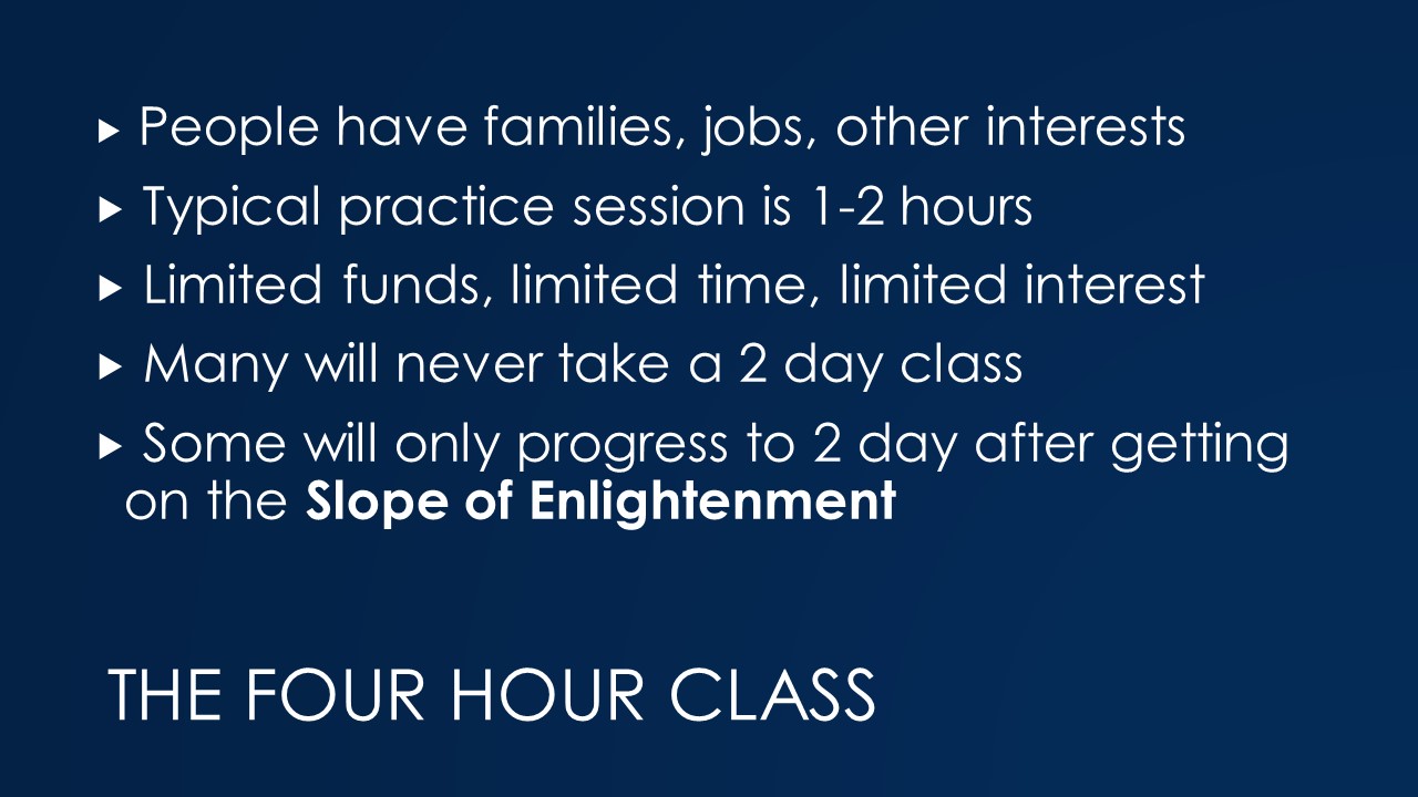 More than a decade I converted most of the courses that KR Training offers into 3- and 4- hour blocks designed as a series. You can’t teach everything someone needs to know in a 4 hour class. So the burden is on the instructor to prioritize skills in their course design.