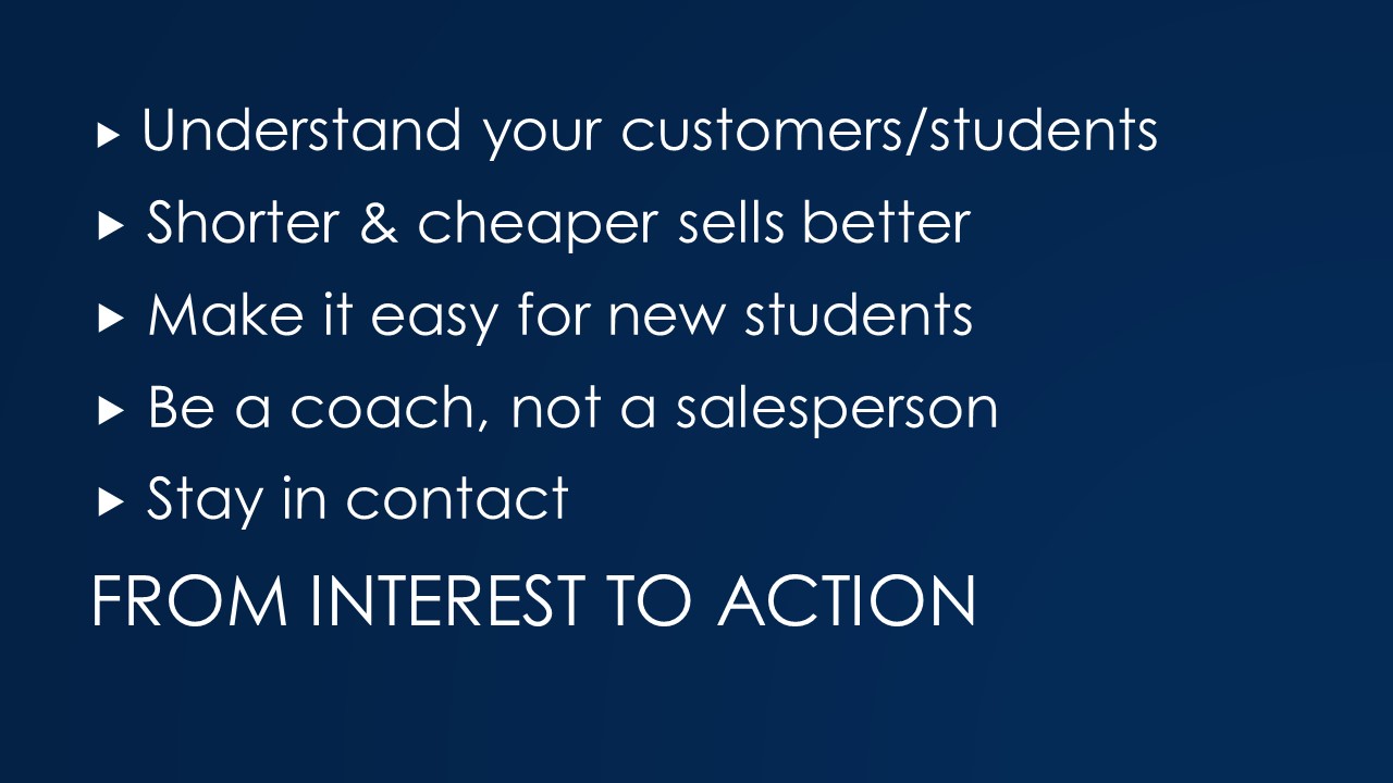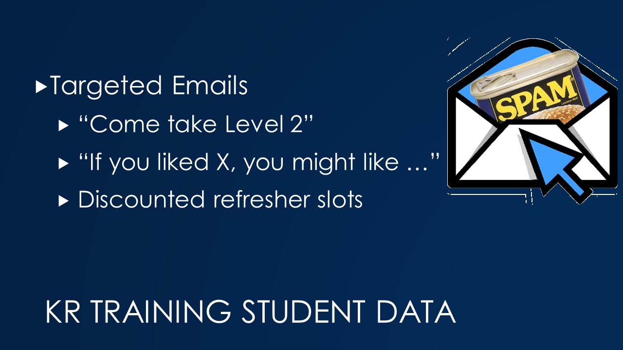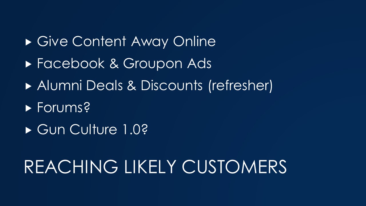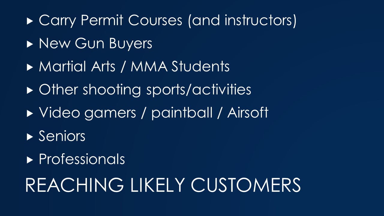 Step 1 in creating a customer that is going to come to more than one class is to get them to one class. The slide shows my list of people that might have interest in training beyond the state minimum, or in some cases, training to prepare them to meet the state minimum.