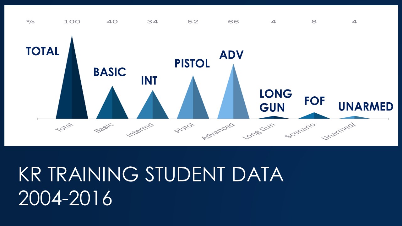 What do students want? Here’s a chart showing which courses were most popular in my program over the past 12 years. Demand for the advanced level pistol classes was the highest, driven by a small number of students who have taken dozens of classes that I’ve taught or hosted. The least popular (despite my strong belief in their value and continued efforts to schedule and promote them) were force on force and unarmed classes.