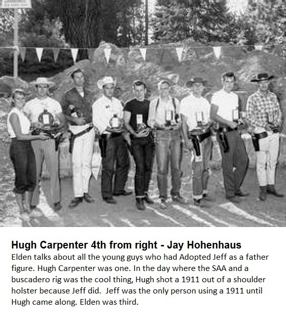 Entered in the Dudes were Walt Stark, chief Los Angeles Police Academy, vs. Maurice Hively of La Crescenta; Dave Wilson of Pasadena, 19-year-old fellow who shot himself and was hospitalized at Santa Anita Hospital at Lake Arrowhead vs Isreal B Cullinan of Montrose; Hugh Carpenter and Jeff Cooper of Bear Valley; A. M. Barr of Los Angeles vs Jim Vaughn of Big Bear; Dee Woolem of Knotts Berry Farm vs William Glaze of Hawthorne; Bob Smith of Los Angeles vs Lynn Makeling of Los Angeles; Jerry Hurst of Los Angeles vs Berty Senseman of Lancaster; Don Nowka of Los Angeles vs Olin Grunby Jr of Los Angeles; Robert C. Holmes and Michael Hipple of Los Angeles and William Wingrove of Los Angeles vs William M Obar of San Bernardino. Hipple was a 16-year-old youth, who using a borrowed gun and rig, worked his way to the semi-finals when he met and was defeated by Nowka.