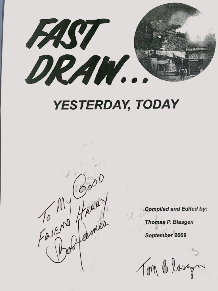 Very few books have been written about the history of fast draw competition, and the few that have been written are out of print. As part of my research for the Historical Handgun book, I’ve been trying to track down copies. As I wrote in a previous entry about this topic, Bob Arganbright’s book has been impossible to find outside of the one copy the Library of Congress has (which I was able to access and read a few years ago). Last year I was able to purchase a copy of the other major work on this topic: Fast Draw…Yesterday Today, which is a 600+ page compilation of magazine articles put together by Tom Blasgen.