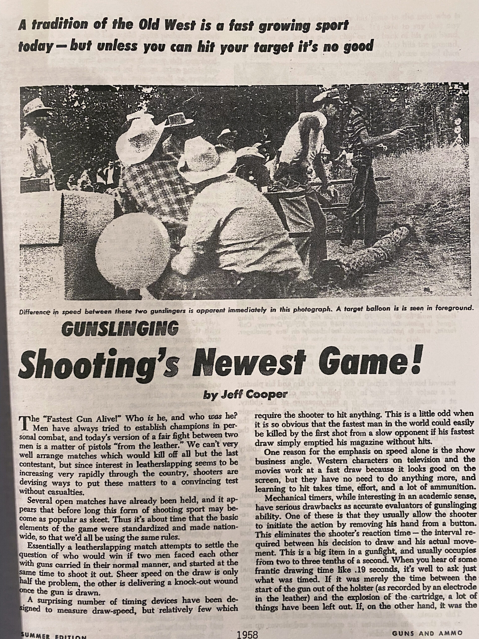 Jeff Cooper wrote about the sport of Fast Draw in Guns and Ammo magazine back in 1958 (the magazine’s first year of publication).