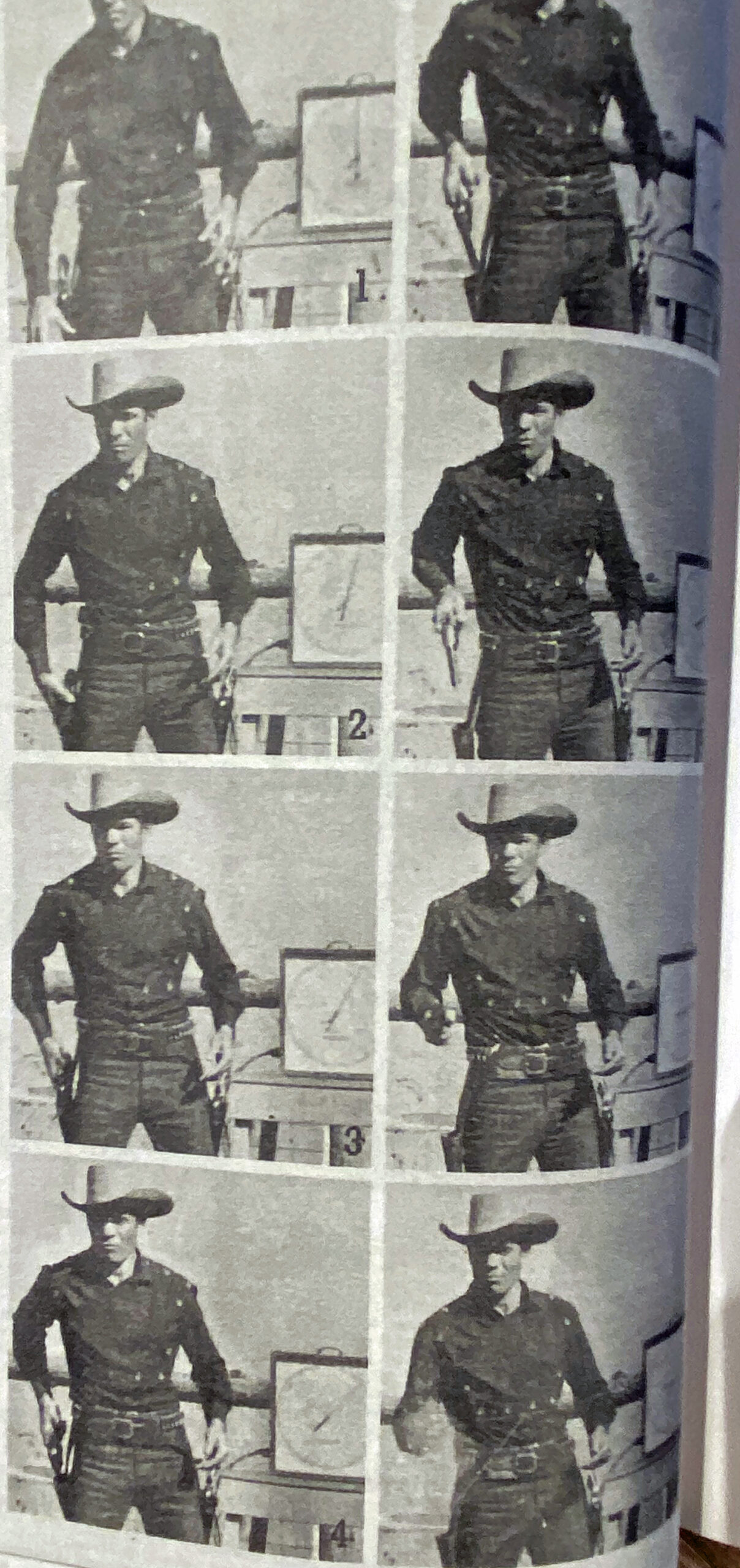 Disclaimer: The book is thick and I did not want to destroy it by flattening it to scan pages, so I took pics with my phone, and you will see some warping and other distortions as I used Photoshop to remove shadows and crop images. But because copies are rare and very hard to find (I lucked into a copy by being on a Fast Draw group on Facebook), I’m including the pics here along with the key points I think anyone interested in the history of pistol technique should know.
