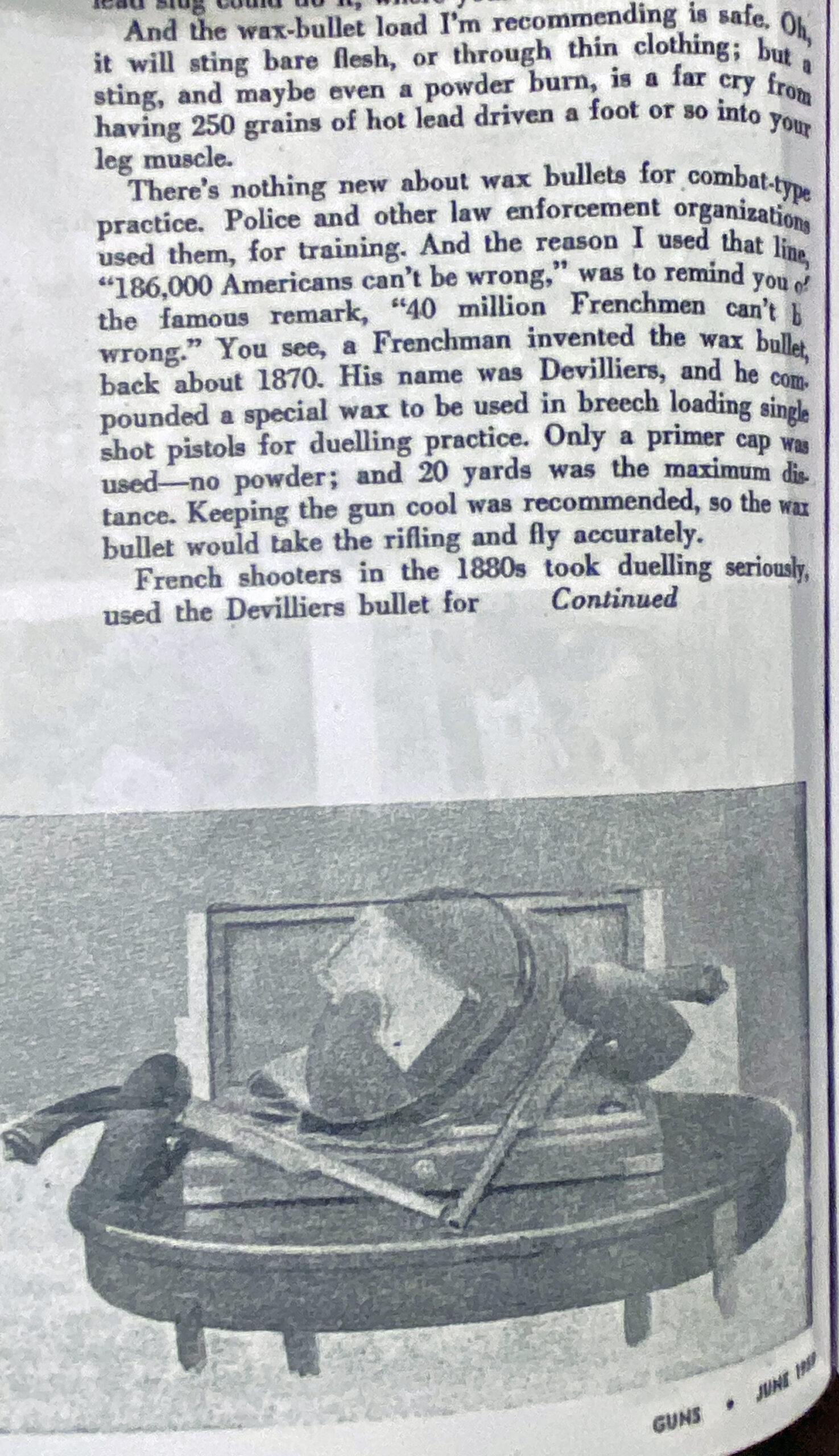 Prior to the 1950’s, wax bullets had been used by early 1900’s dueling trainers, whose force on force sport of simulated dueling was the precursor to modern paintball and marking rounds used in combatives training. Simulated dueling even made a one time appearance in the Olympics.
