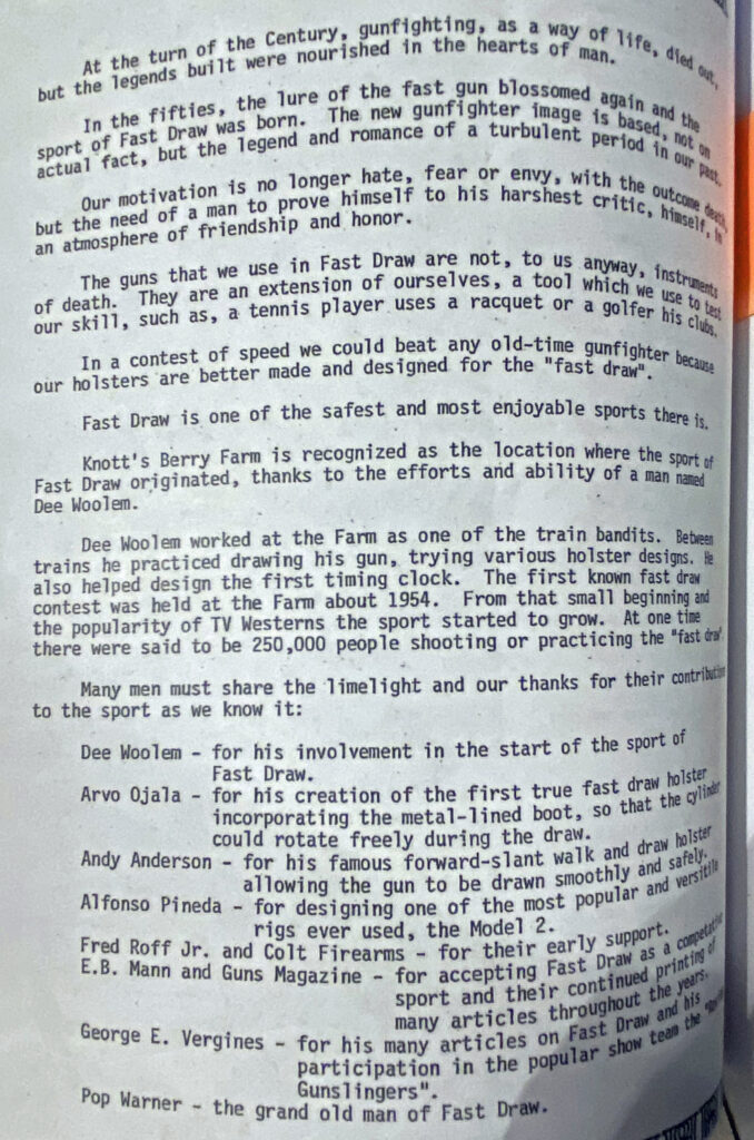 This page gives the highest level summary of the sport: started in 1954 at Knott’s Berry Farm by the stunt show gunfighters and a tech who developed the first shooting timer.