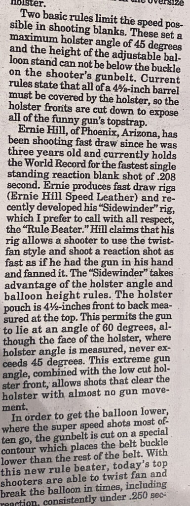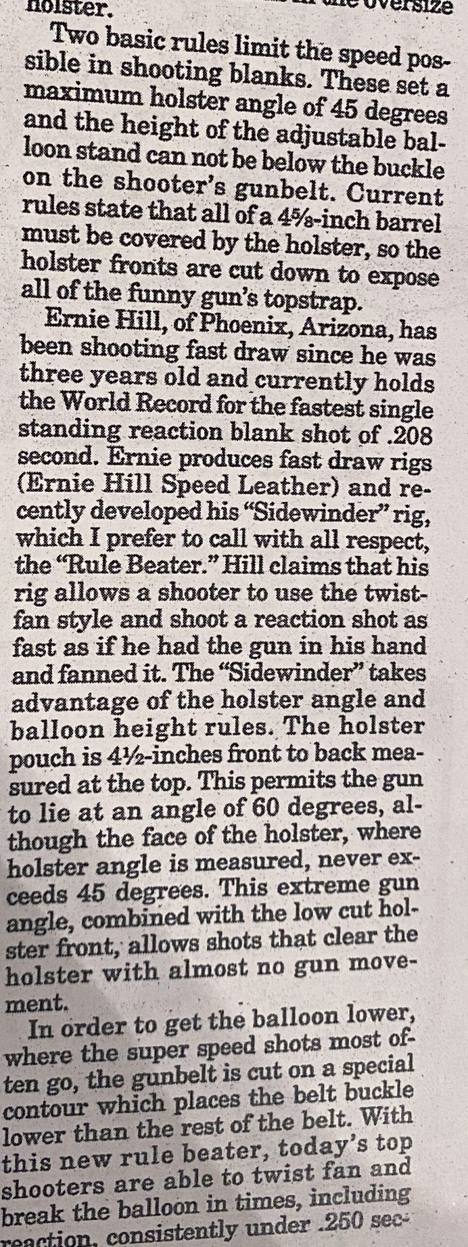 This article mentions Ernie Hill, who started out making fast draw holsters and shooting fast draw matches, who became the dominant holster maker for IPSC in its early days, making the same kind of steel reinforced leather holsters the fast draw shooters used, only for 1911 pistols.