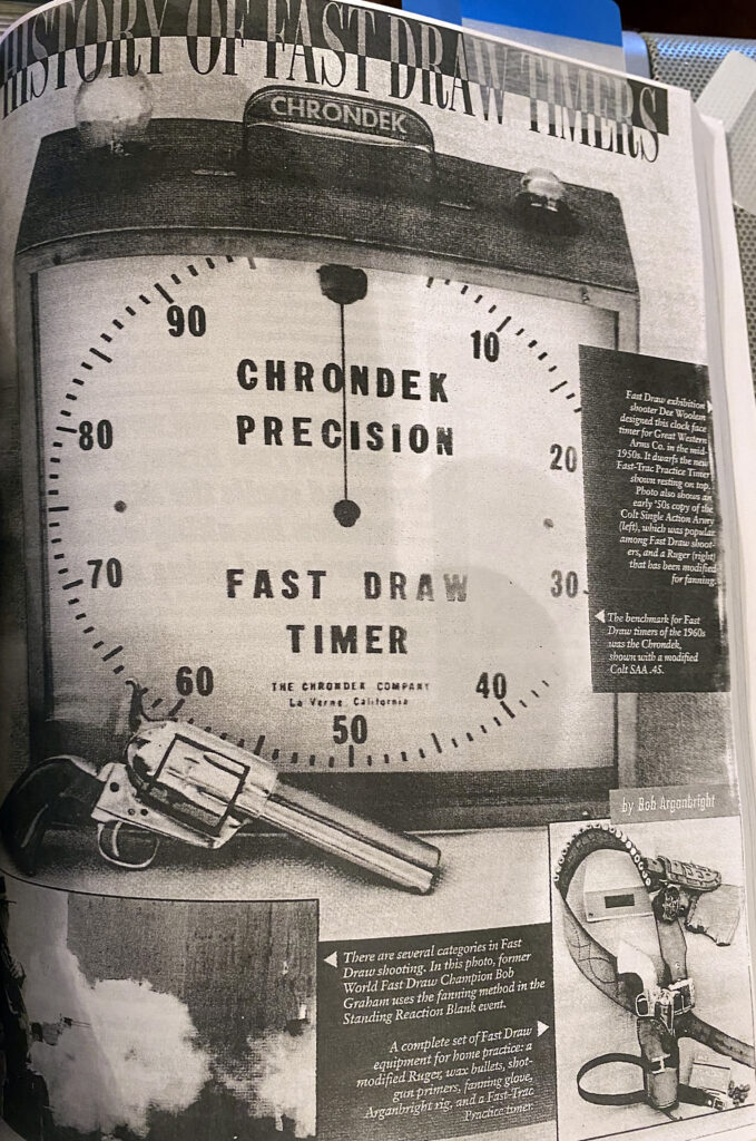 At the peak, Fast Draw championships, sponsored by Colt, were held in Las Vegas in the early 1960’s. Interest in fast draw led to many innovations in holsters and timers, and technique. Shooters using the “twist draw” technique, where the gun was fired at a 90 degree angle, began beating the traditional fast draw competitors, and shooters began transitioning to stronger-built Ruger sixguns. As with most other shooting sports, gamers, gamer gear, and gamer techniques pushed the limits of performance but also drove many in the general population away from the game.