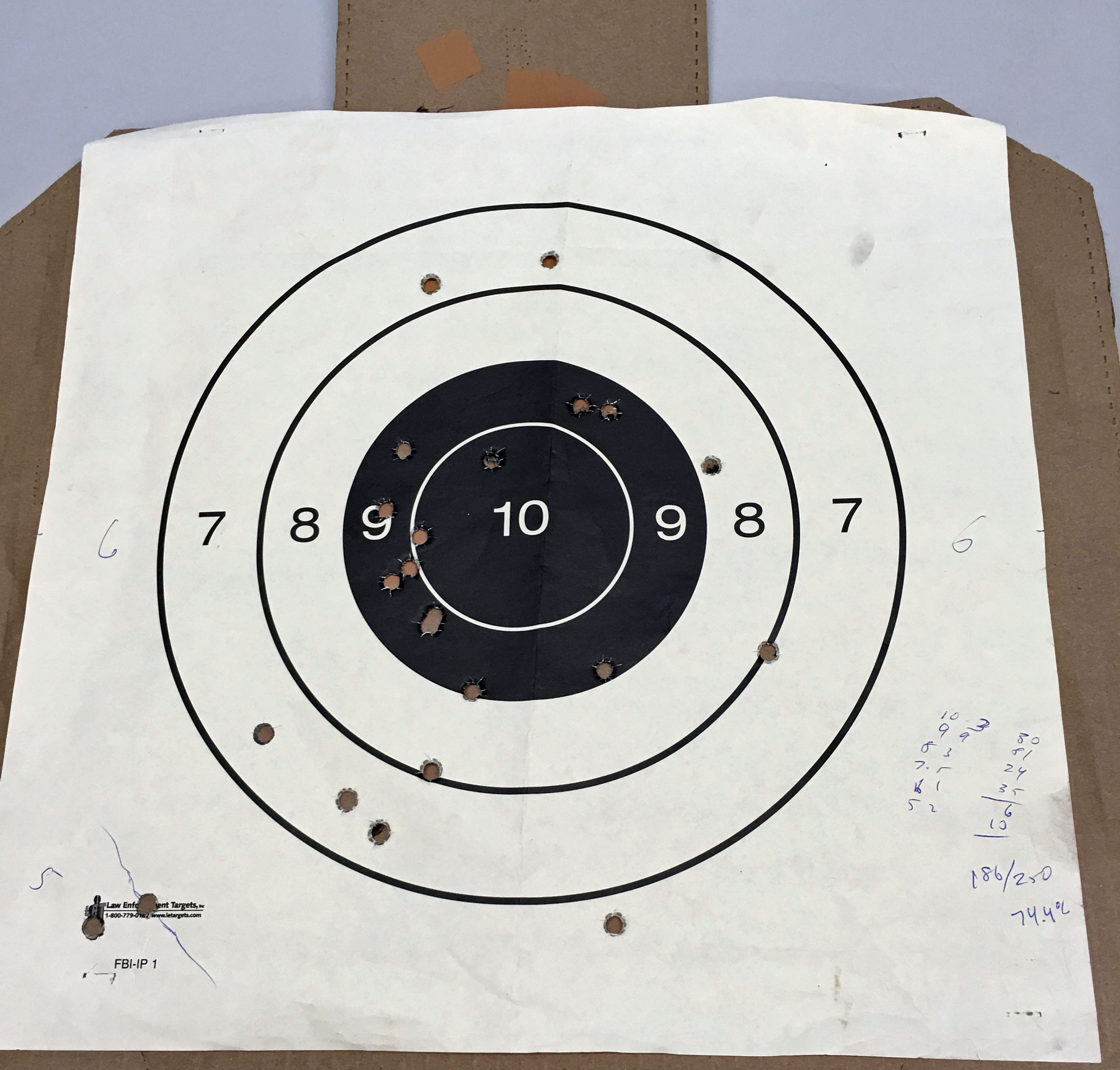 I shot the drill cold without doing any dry fire runs on it, using my S&W 686 revolver, one handed, thumb cocking each shot as they did in the 30’s. My score was 186 out of 250 possible. I used the FBI-IP target, which had bullseye dimensions matching those listed in the book, but lacked the 5 and 6 rings the book described. I drew in a rough 6 ring, which allowed me to pick up the two 6’s and one 5 outside the printed target.