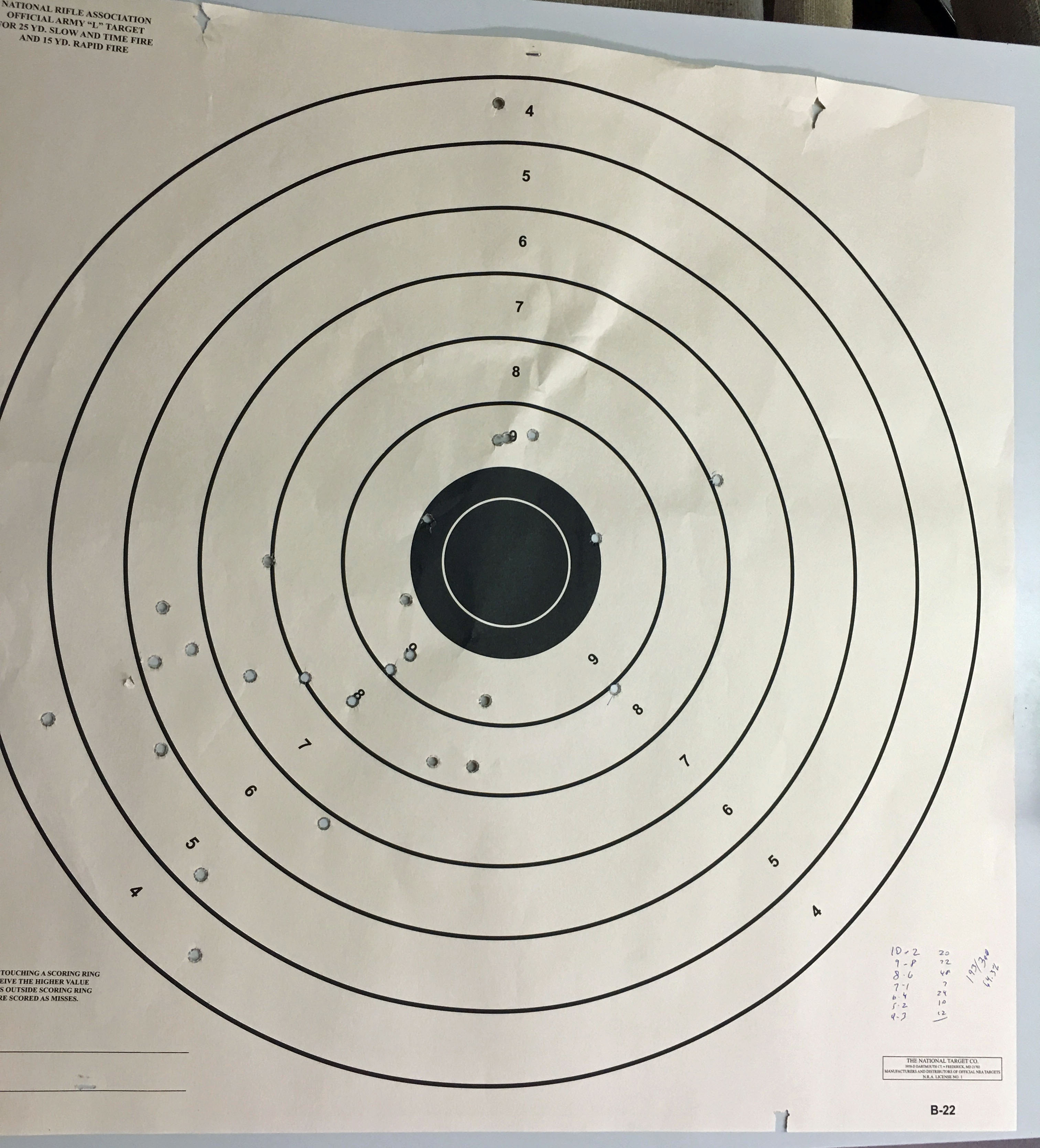I had my student shoot another drill from the book that used the Army L (NRA B-22) target. It’s quite a bit larger, with bigger scoring rings, than the FBI-IP, but the 15 yard string has a shorter time limit (11 seconds) than the 15 seconds used in the previous test.