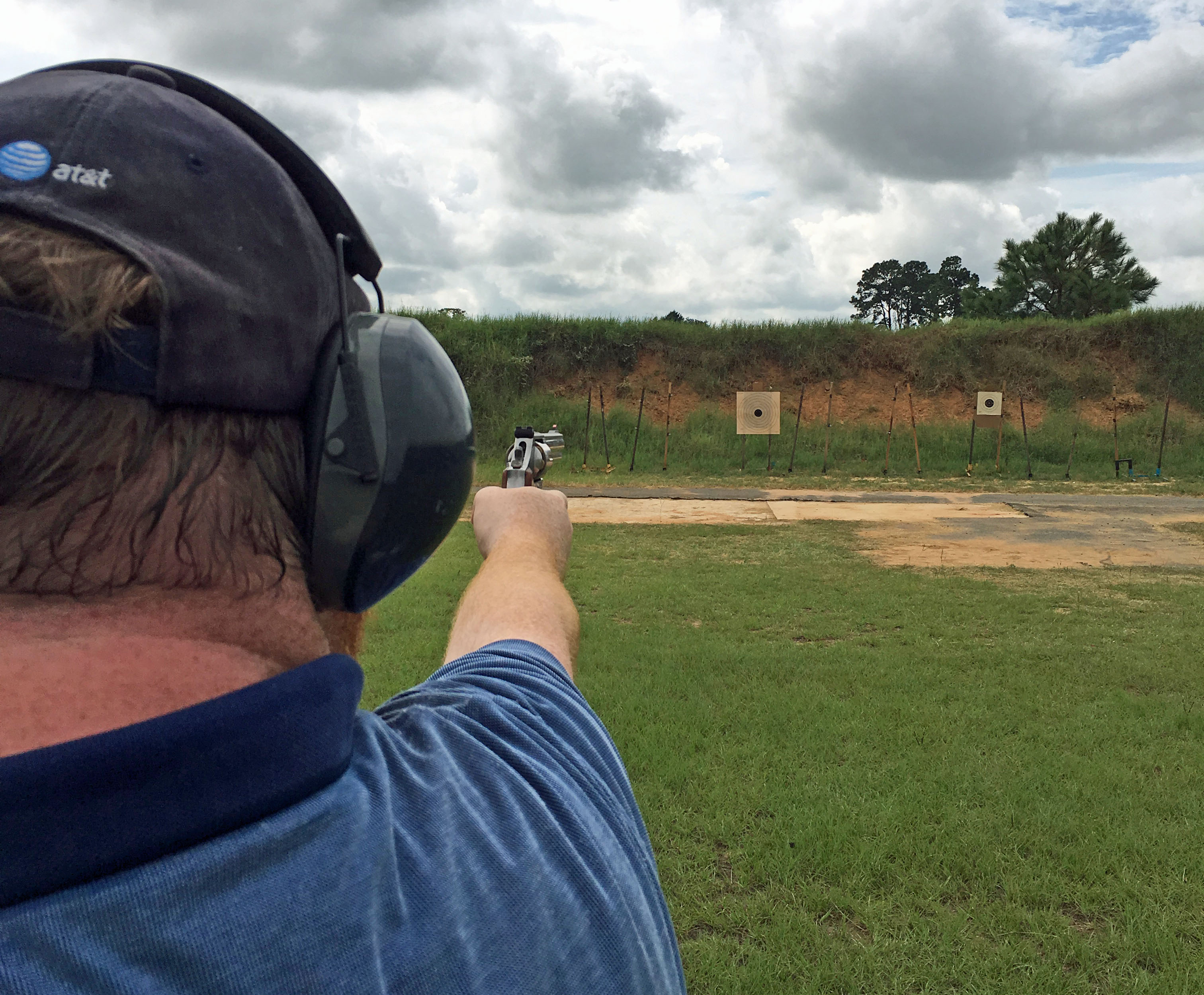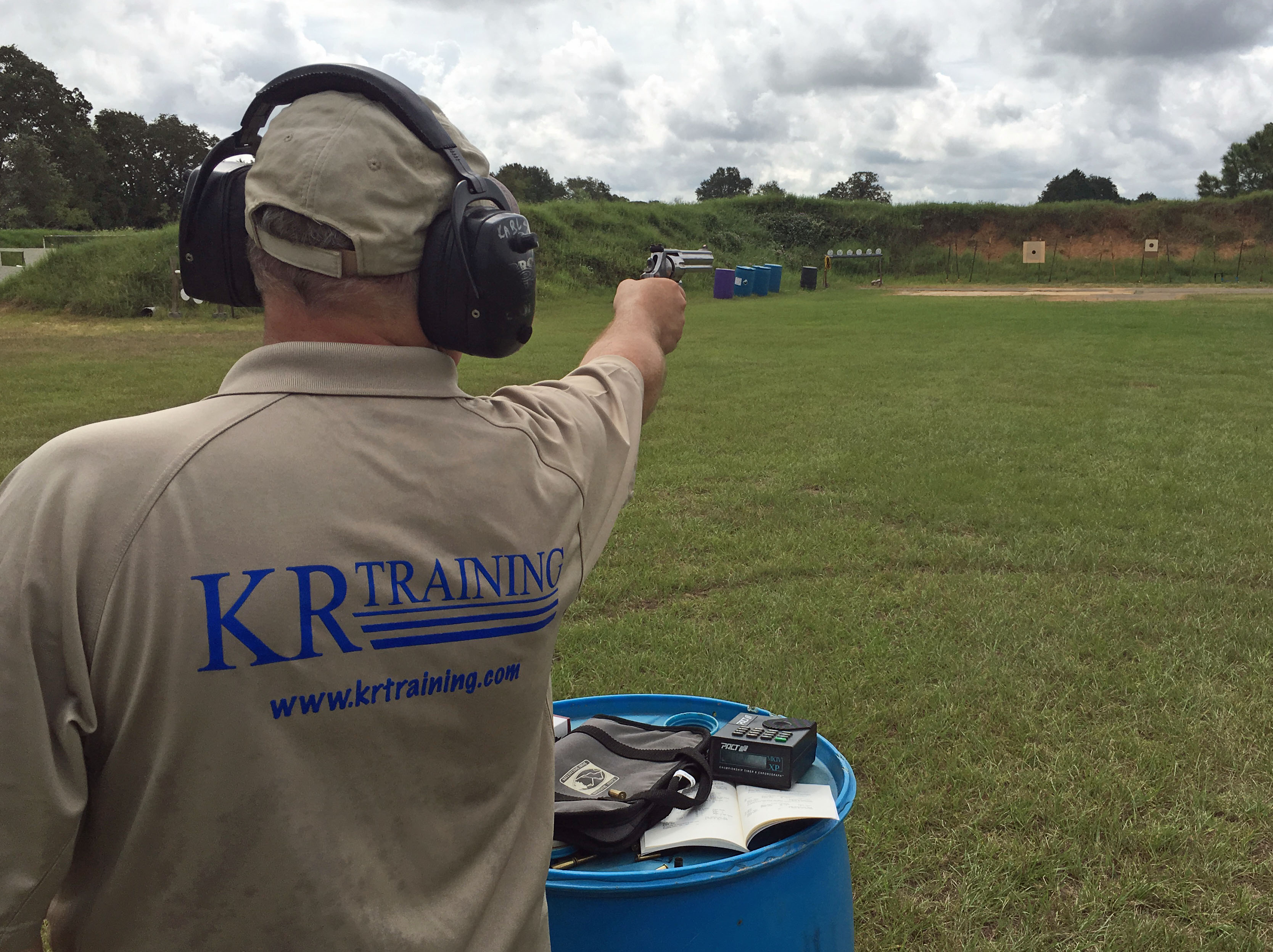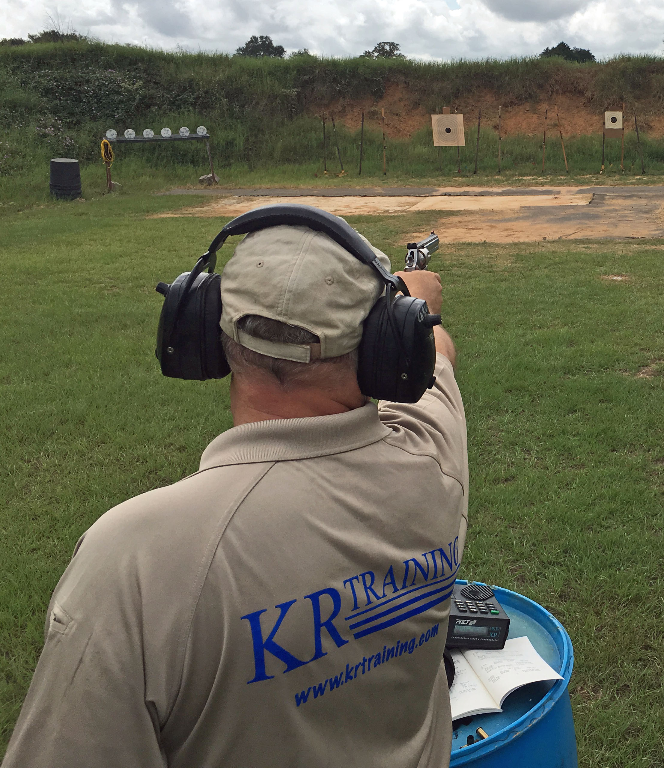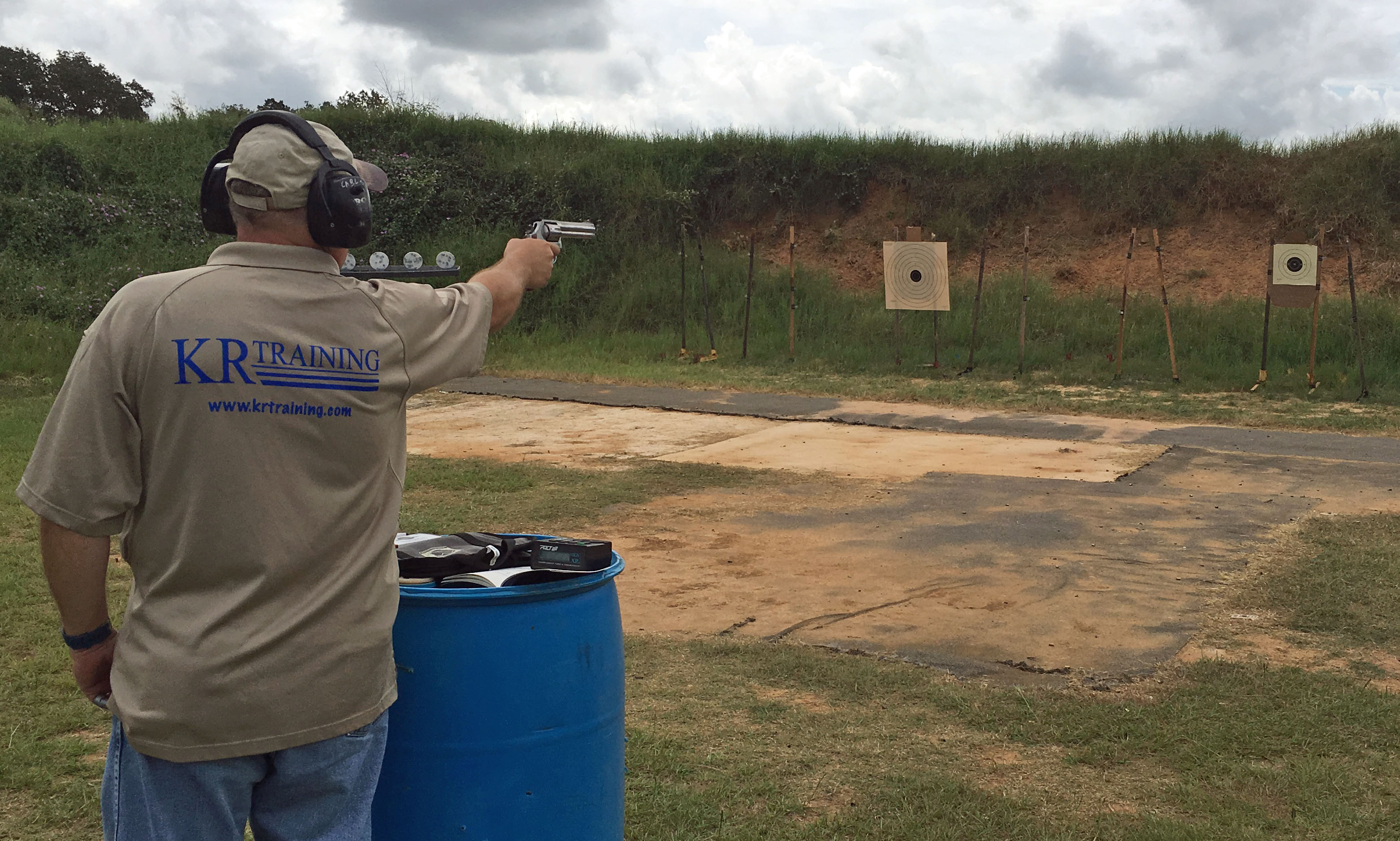 I had him shoot my 686 revolver, also shooting the drill cold with no dry fire warmup. He shot over 90% on the Texas LTC test, and passed my “3 Seconds or Less” test with a score over 80%, using an M&P Shield. On this drill, he shot 64% with a lot of low-left hits, likely due to the very different feel the grip and trigger of a 6″ barrel DA revolver (shot single action) has compared to a polymer striker fired subcompact semiauto pistol.