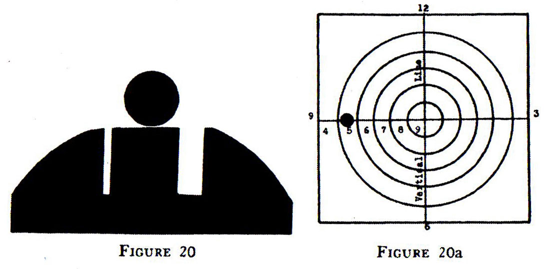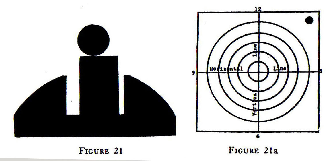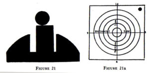 The chapter on sighting includes many well drawn examples showing the effect of incorrect aiming on a 25 yard target. In these pictures, the black dot is the bullseye center, as it appears to the shooter firing at that target at 25 yards.