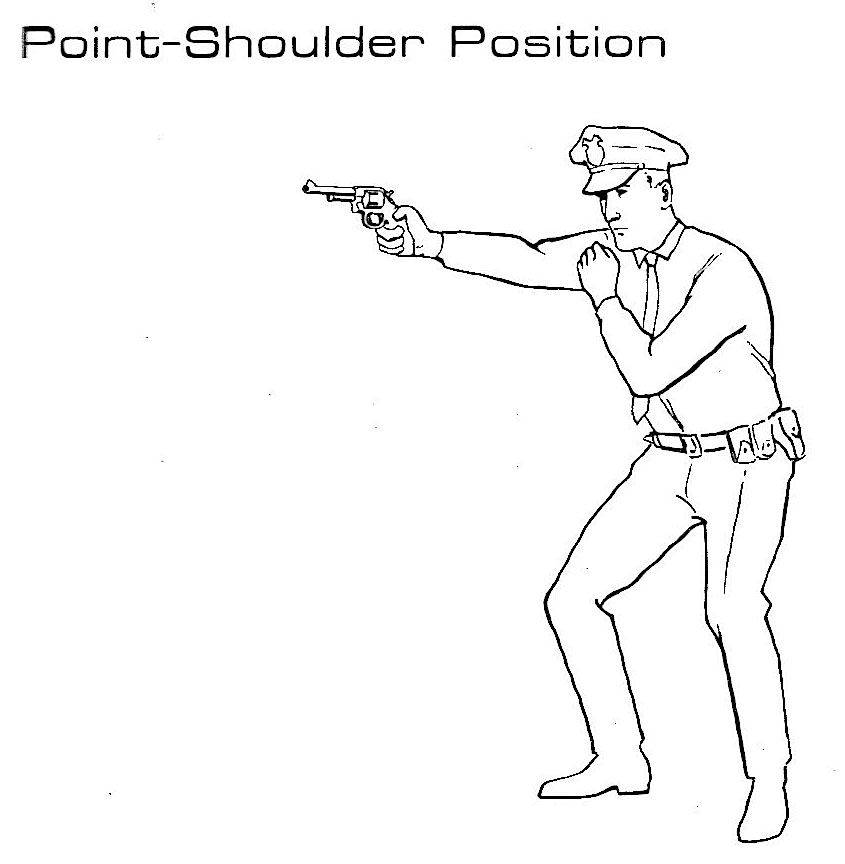 To the authors, this means using the revolver in double action, and not aiming. In addition to the 1940’s FBI approach of hip shooting, a point-shoulder position is taught.