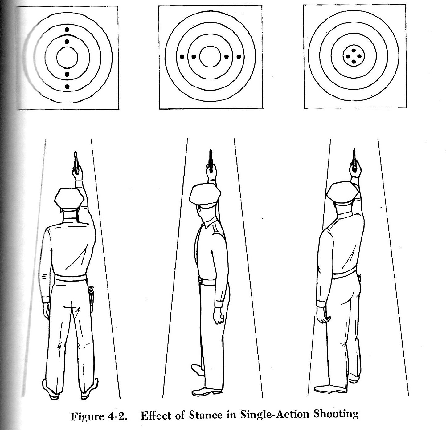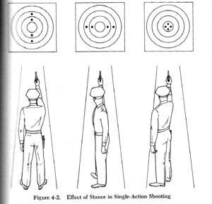The student who faces the target directly will have difficulty controlling the elevation of his shots and will have a tendency rock back and forth…if the student shooter stands at a ninety degree angle..he will probably find that the shots spread right to left.